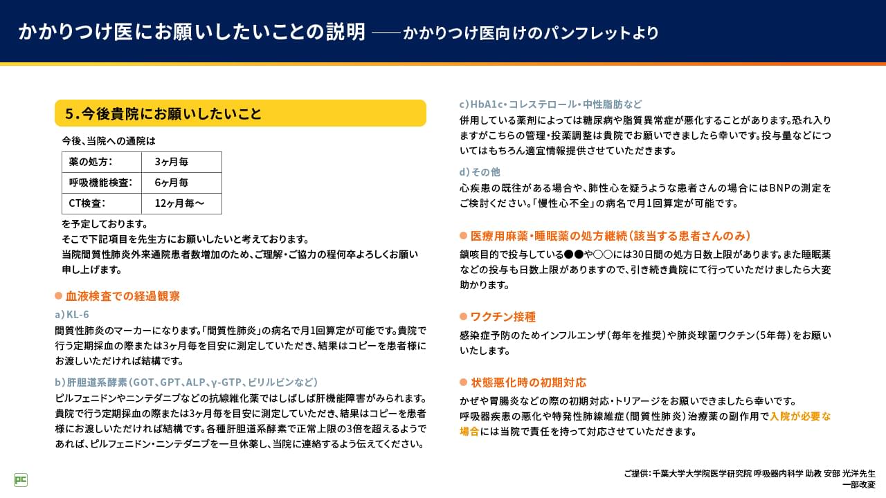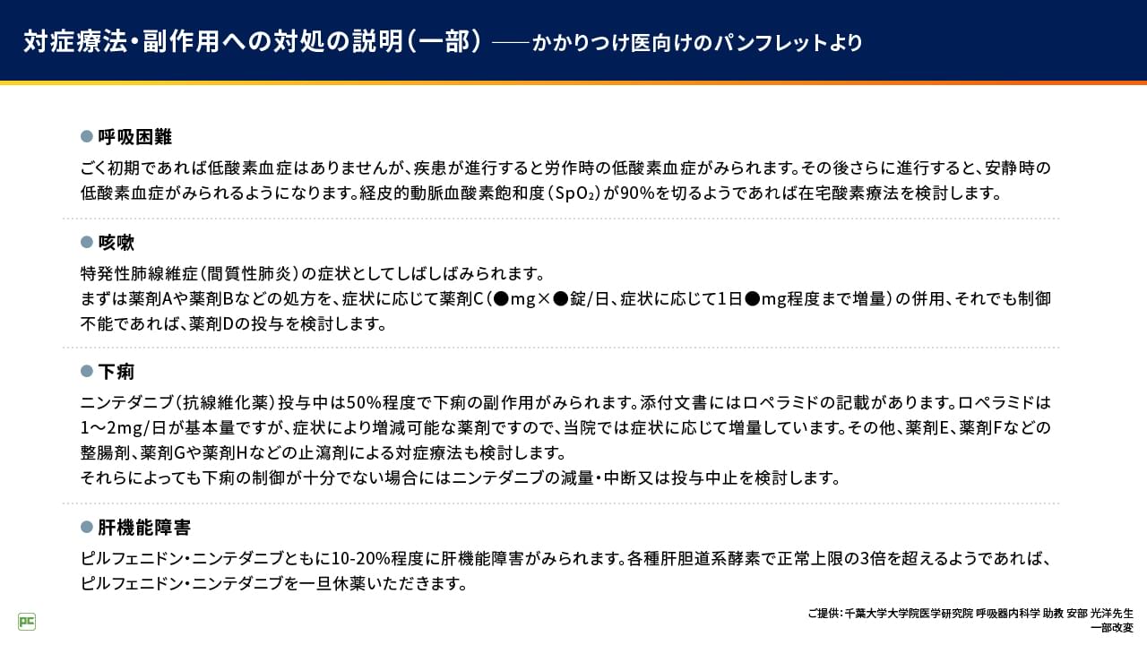 そのほかにも、たとえば消化器内科が専門であるかかりつけ医の先生が、抗線維化薬の副作用のひとつである下痢に対し、ご自身の専門性を活かして対応されている場合などもあります。こうした点も、患者さんにとってのメリットになり得ると考えます。