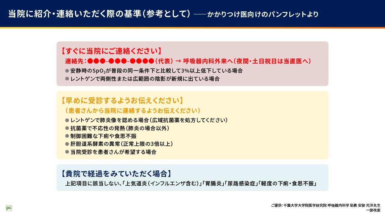 パンフレットの最後には、当院に紹介・連絡いただく際の基準を3色に分けて示し、なるべく先生方が対応に困らないようにしています(図4)。赤色で示しているのは、すぐに当院に連絡してほしい、急性増悪を疑うような場合です。黄色で示しているのは、早めに受診するよう患者さんに伝えてほしい、酸素飽和度が低下するような肺炎や中等度以上の抗線維化薬の副作用がみられる場合です。青色で示しているのは、かかりつけ医の先生で引き続き様子をみていただく場合になります。