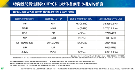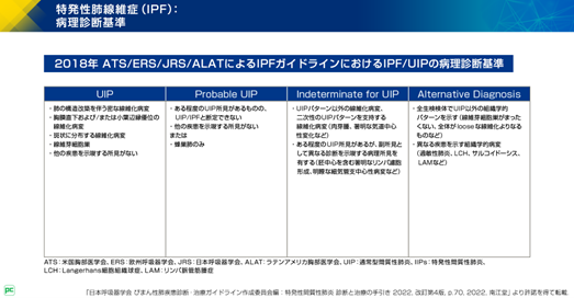 - 日本呼吸器学会 びまん性肺疾患診断・治療ガイドライン作成委員会編:特発性間質性肺炎 診断と治療の手引き 2022, 改訂第4版, p.12, 2022, 南江堂