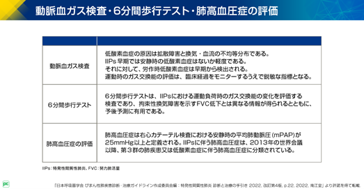 ILDの早期発見や予後予測に有用な検査として、胸部X線やHRCT等の画像検査、呼吸機能検査、血液検査、動脈血ガス検査、6分間歩行テスト、肺高血圧症の評価があります。