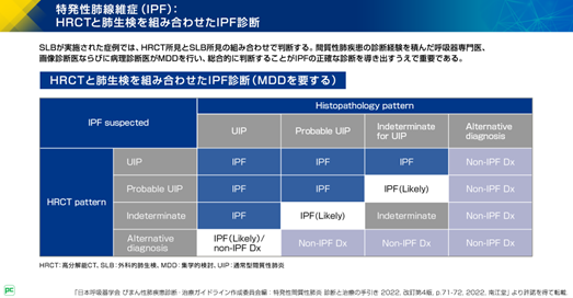 まず、IPFの診断は、図8の表に示すように、HRCT所見と外科的肺生検(SLB)所見を組み合わせて行います。なお、HRCT所見で典型的なUIPパターンの場合は、IPFの確定診断にSLBは必要ではありません。また、HRCTでProbable UIPパターンの場合でもSLBを実施せずに診断を確定することも許容されています。