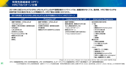 IPFのHRCTパターン及び病理診断パターンはそれぞれ、UIP、Probable UIP、Indeterminate for UIP、Alternative Diagnosisの4段階に分類されます。各HRCTパターンの特徴は図9、病理診断パターンの特徴は図10のとおりです。