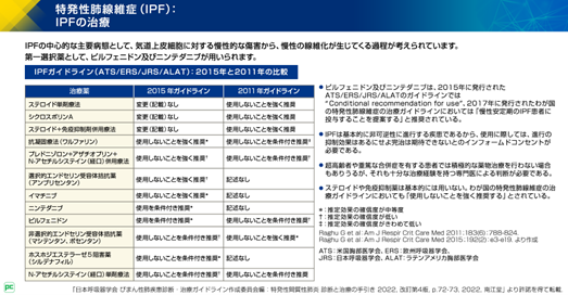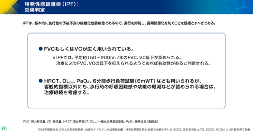 また、IPFは基本的に進行性の予後不良の線維化性肺疾患であるため、進行を抑制し、悪化を長期間にわたり防ぐことが治療の目標となります。
