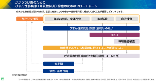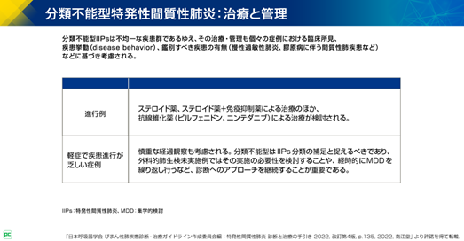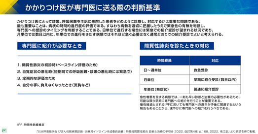 今回は、『特発性間質性肺炎 診断と治療の手引き 2022 改訂第4版』から、IIPsの診断の進め方、IIPsに含まれる疾患ごとの治療、かかりつけ医から専門医への紹介のタイミングについて紹介しました。