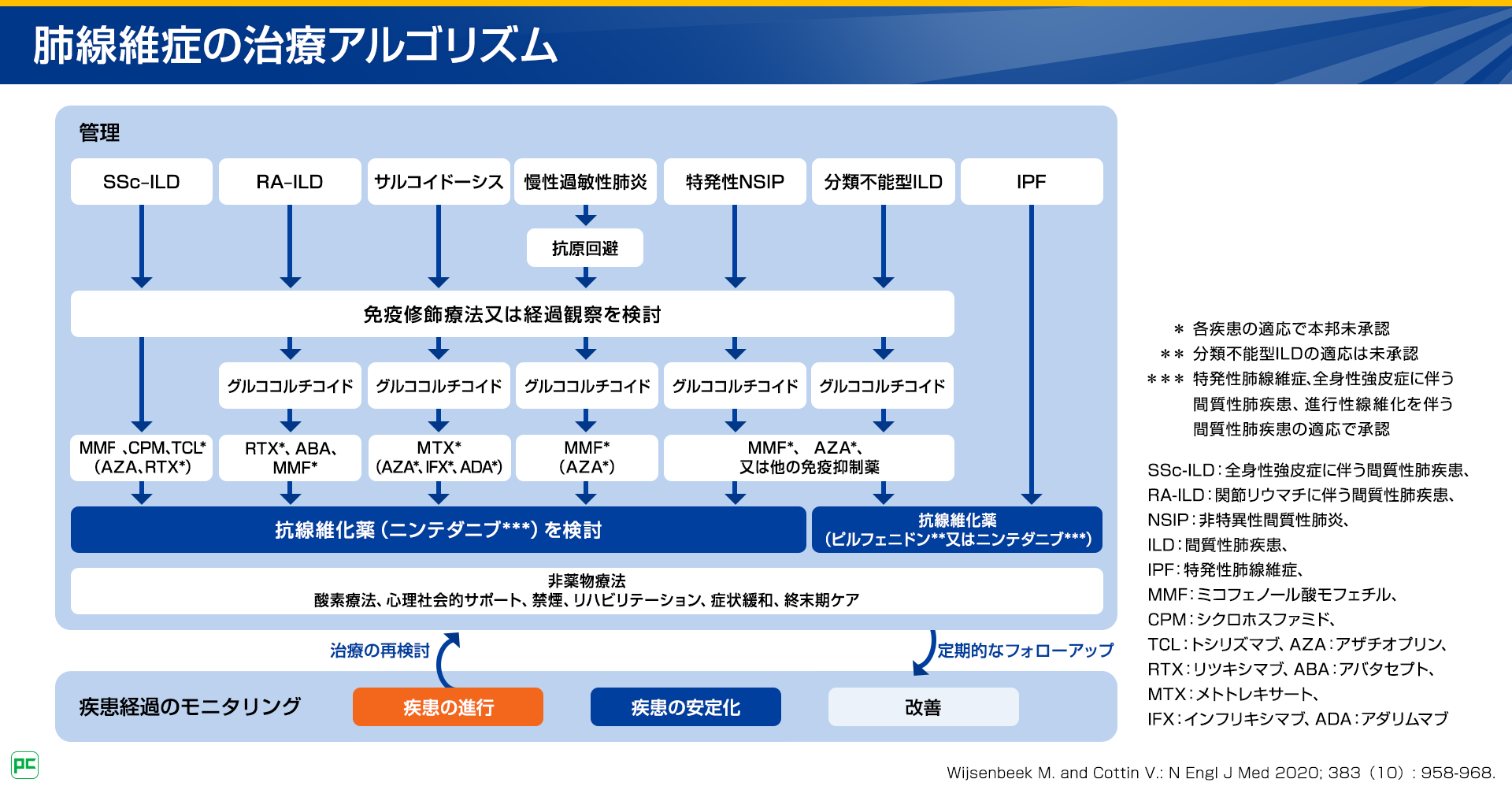 実際の治療においては、こちらの肺線維症の治療アルゴリズムが参考になります。