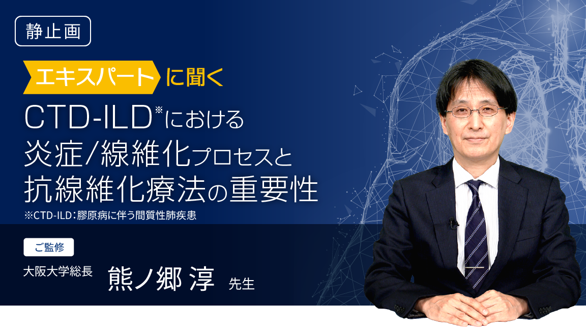 膠原病に伴う間質性肺疾患(CTD-ILD)においては、原疾患に対する抗炎症治療を行っても線維化の進行がしばしば認められます。そのため、間質性肺疾患(ILD)の発症早期から定期的に高解像度CT(HRCT)や呼吸機能検査を用いて進行性の線維化に対するモニタリングを行い、それらを見逃さずに適切なタイミングで抗線維化療法の開始を検討することが重要になります。今回は、CTD-ILDにおける炎症/線維化プロセスと抗線維化療法の重要性についてご紹介します。