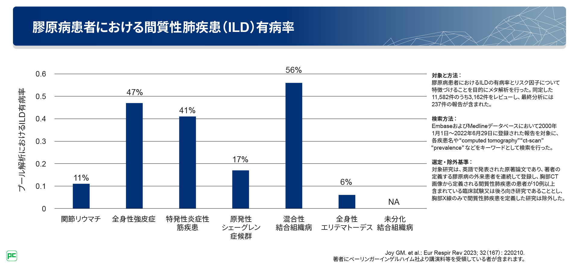 膠原病におけるILDの有病率は報告によって異なるものの、2023年に報告されたメタ解析では、関節リウマチで11%、全身性強皮症で47%、特発性炎症性筋疾患で41%、原発性シェーグレン症候群で17%、混合性結合組織病で56%、全身性エリテマトーデスで6%と報告されています(図1)。