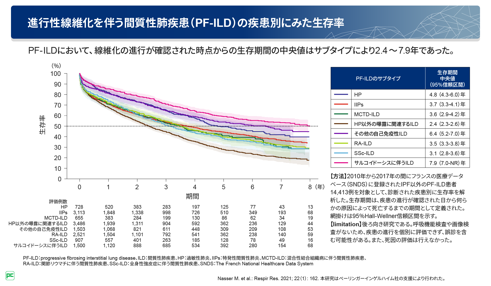 進行性線維化を伴う間質性肺疾患(PF-ILD)の予後は基礎疾患によって異なるものの、一般的に不良です。フランスの医療データベースを用いた解析によると、各疾患における生存期間中央値は全身性強皮症に伴う間質性肺疾患(SSc-ILD)で3.1年、関節リウマチに伴う間質性肺疾患(RA-ILD)で3.5年、混合性結合組織病に伴う間質性肺疾患(MCTD-ILD)で3.6年でした(図3)。