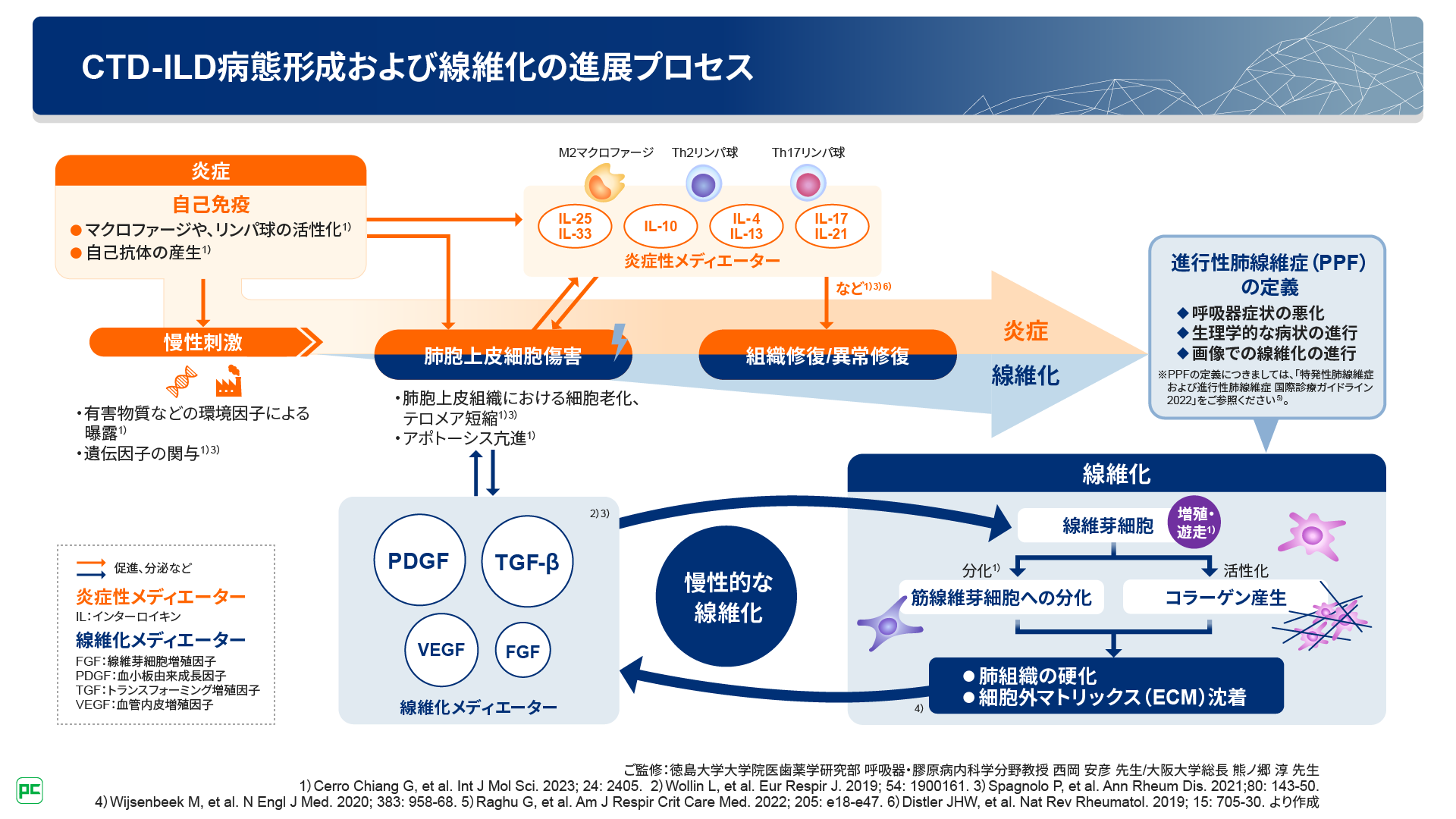 CTDの病態にはマクロファージ・リンパ球の活性化や自己抗体の産生などによる炎症が関与していますが、ILDの発症後は、炎症と線維化が早期から相互に作用してILDが進行すると考えられています。