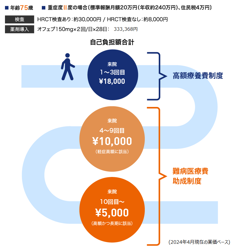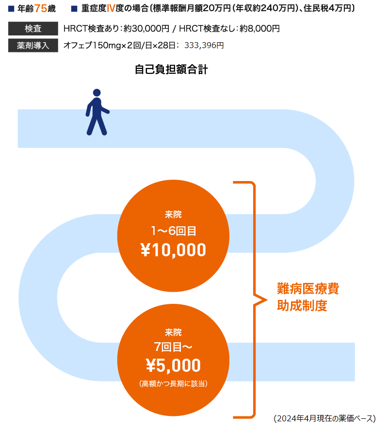 75歳、重症度Ⅳ度のIPF患者さんでは、難病医療費助成制度を活用することで、月々の自己負担額は10,000円までに抑えることができます。