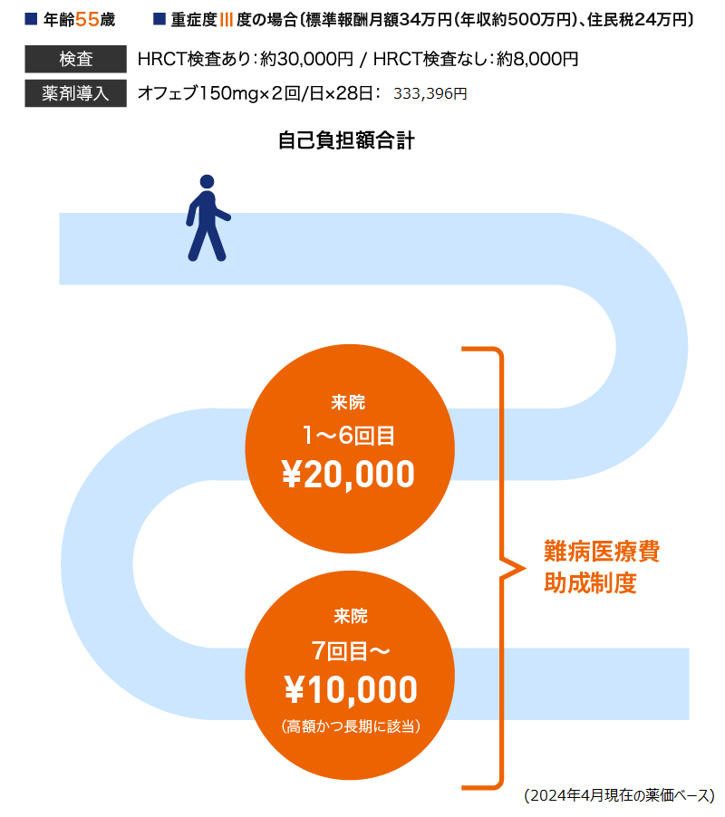 55歳、重症度Ⅲ度のIPF患者さんでは、難病医療費助成制度を活用することで、月々の自己負担額は20,000円までに抑えることができます。