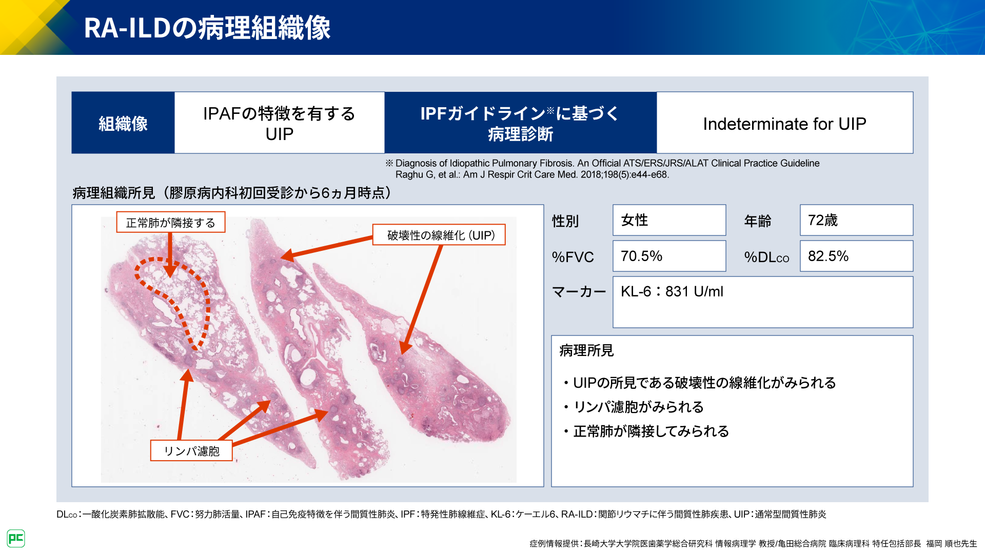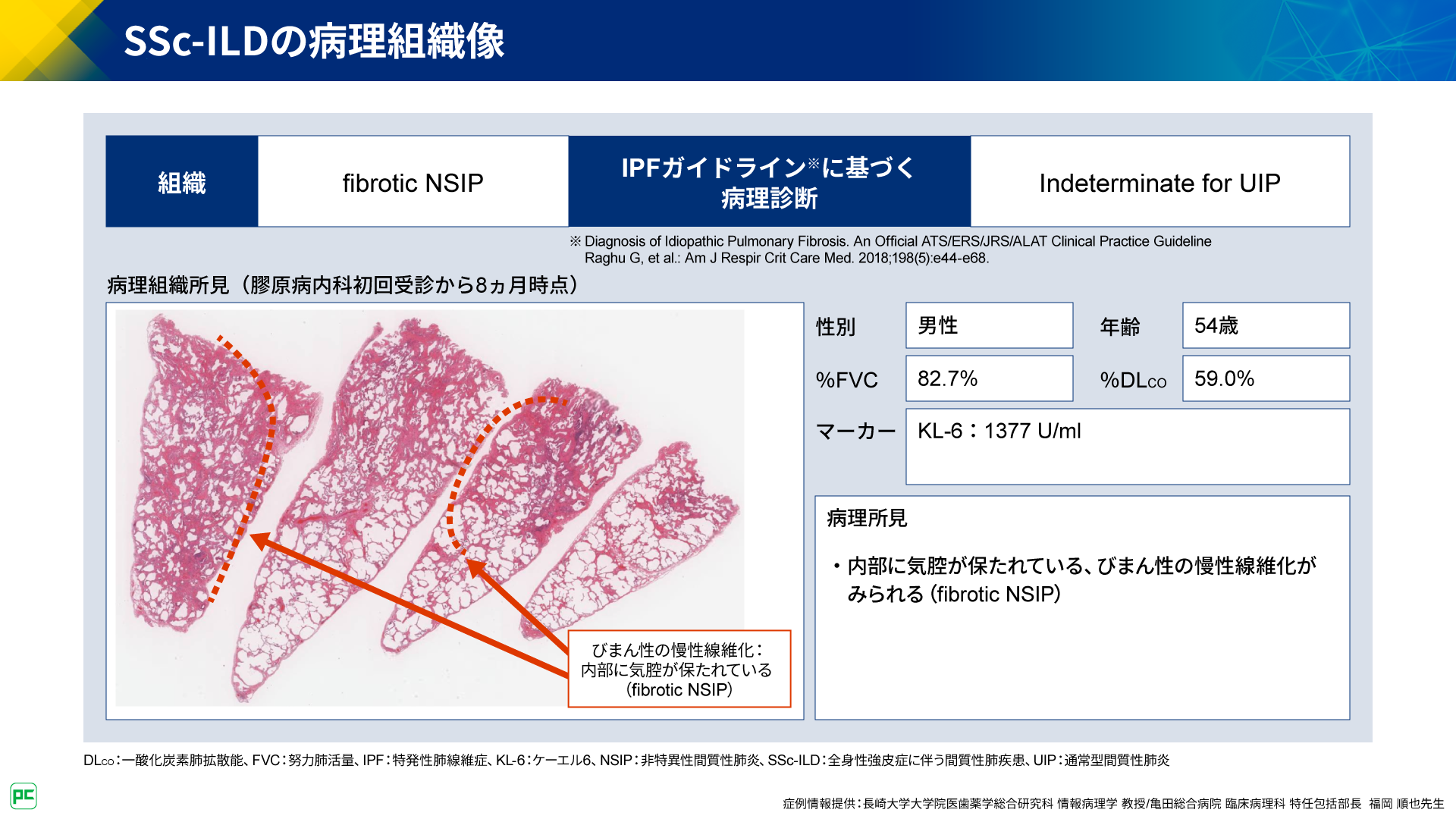 炎症と線維化が混在した肺の病理組織像など、発症早期でも進行性の肺線維化の可能性が考えられる検査所見がCTD-ILD患者さんで得られた場合は、抗線維化薬の導入を治療選択肢のひとつとしてご検討いただけますと幸いです。
