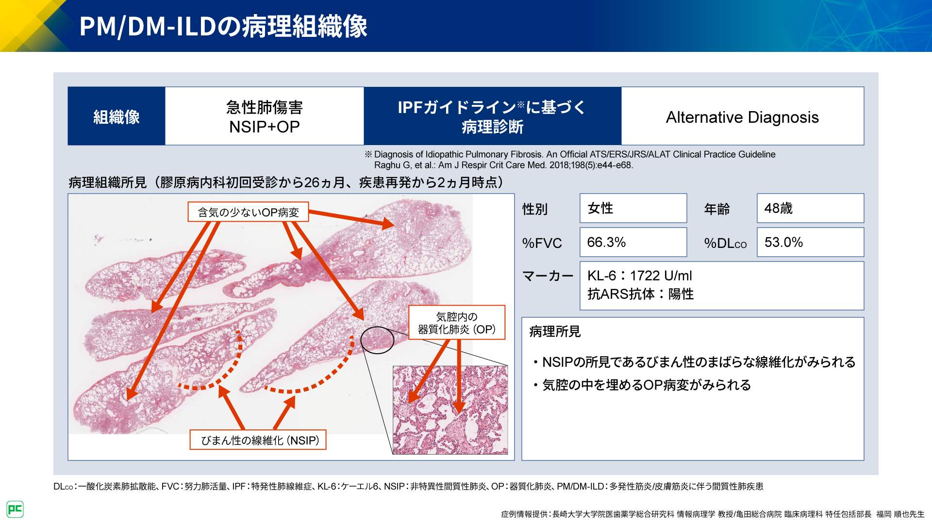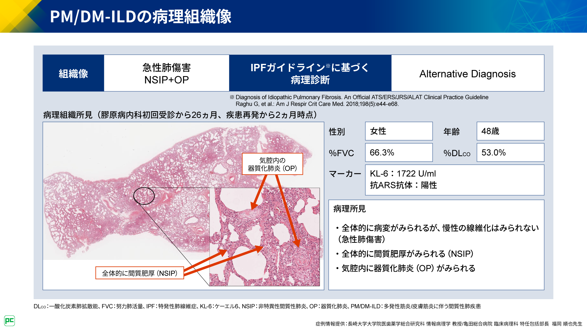 図3、4は、48歳女性PM/DM-ILD患者さんの膠原病内科初回受診から26ヵ月、疾患再発から2ヵ月時点の病理組織像です。