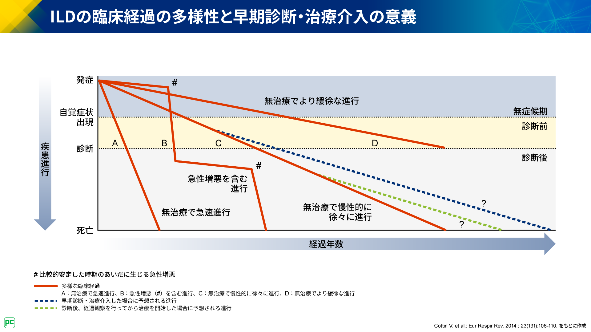 CTD-ILDも含め、ILD全般において、予後不良が予測される場合には、より早期から治療介入を行うことで生命予後を延長できる可能性が考えられています。