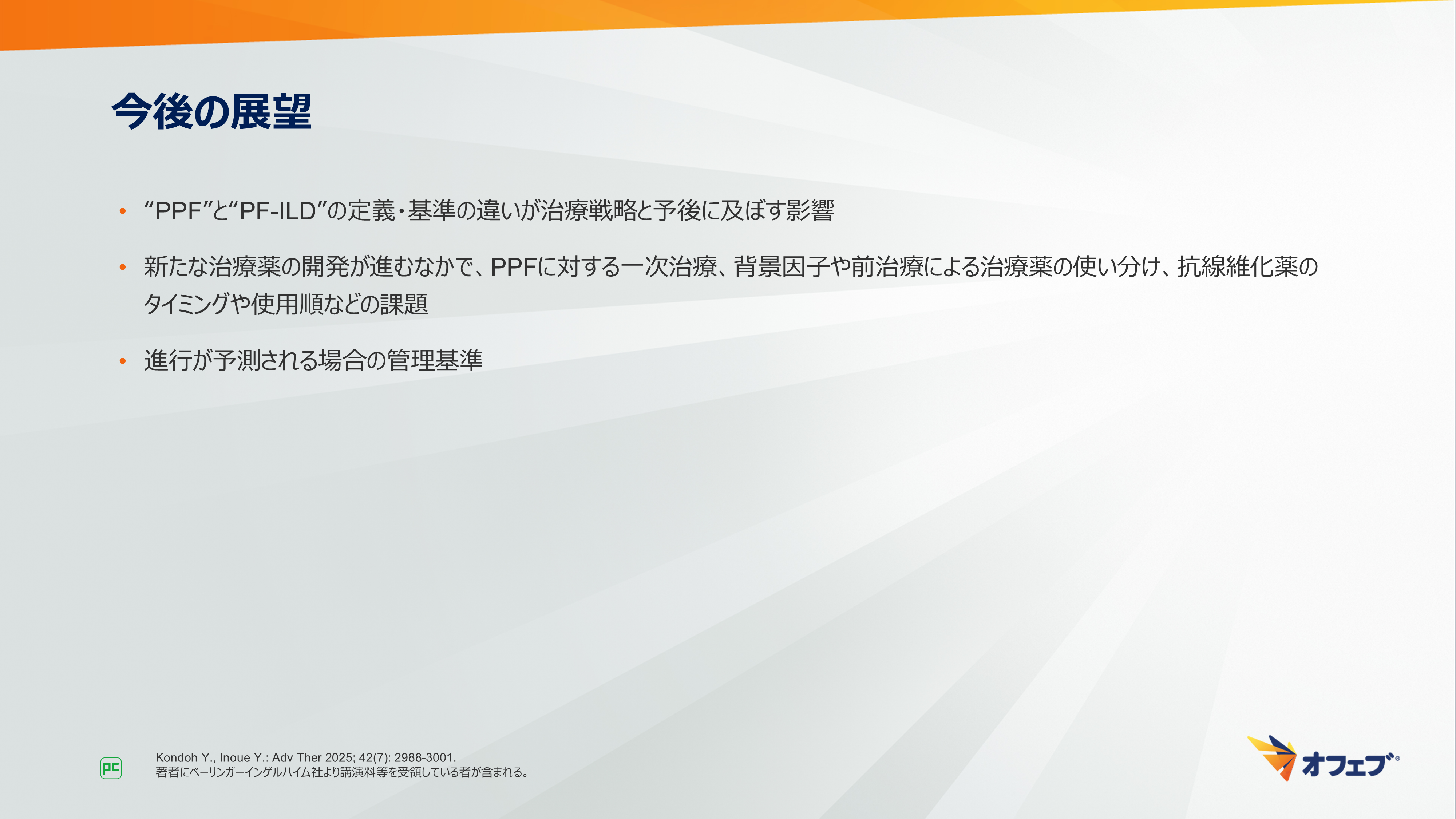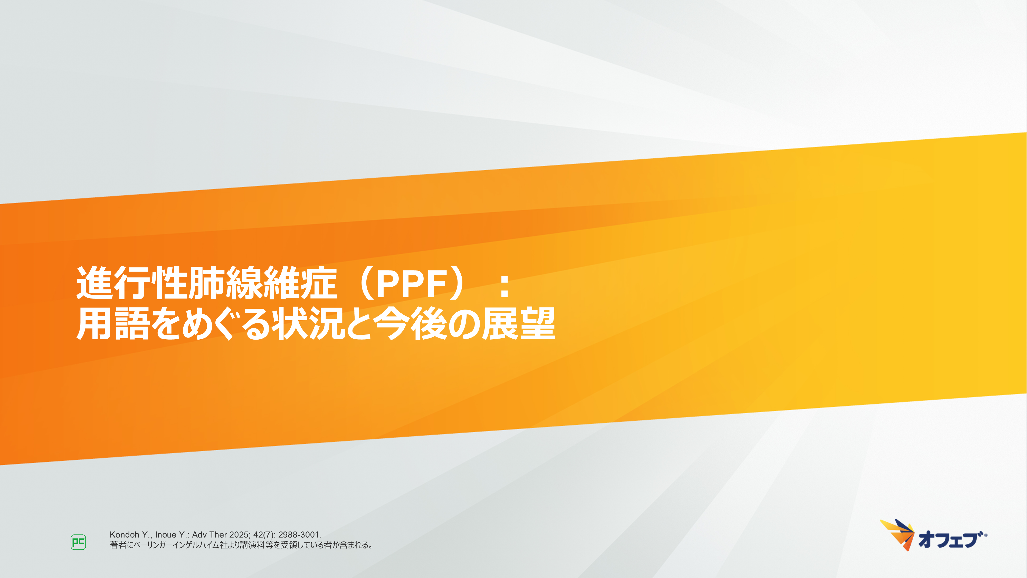 - Kondoh Y., Inoue Y.: Adv Ther 2025; 427(7): 2988-3001. 著者にベーリンガーインゲルハイム社より講演料等を受領している者が含まれる。