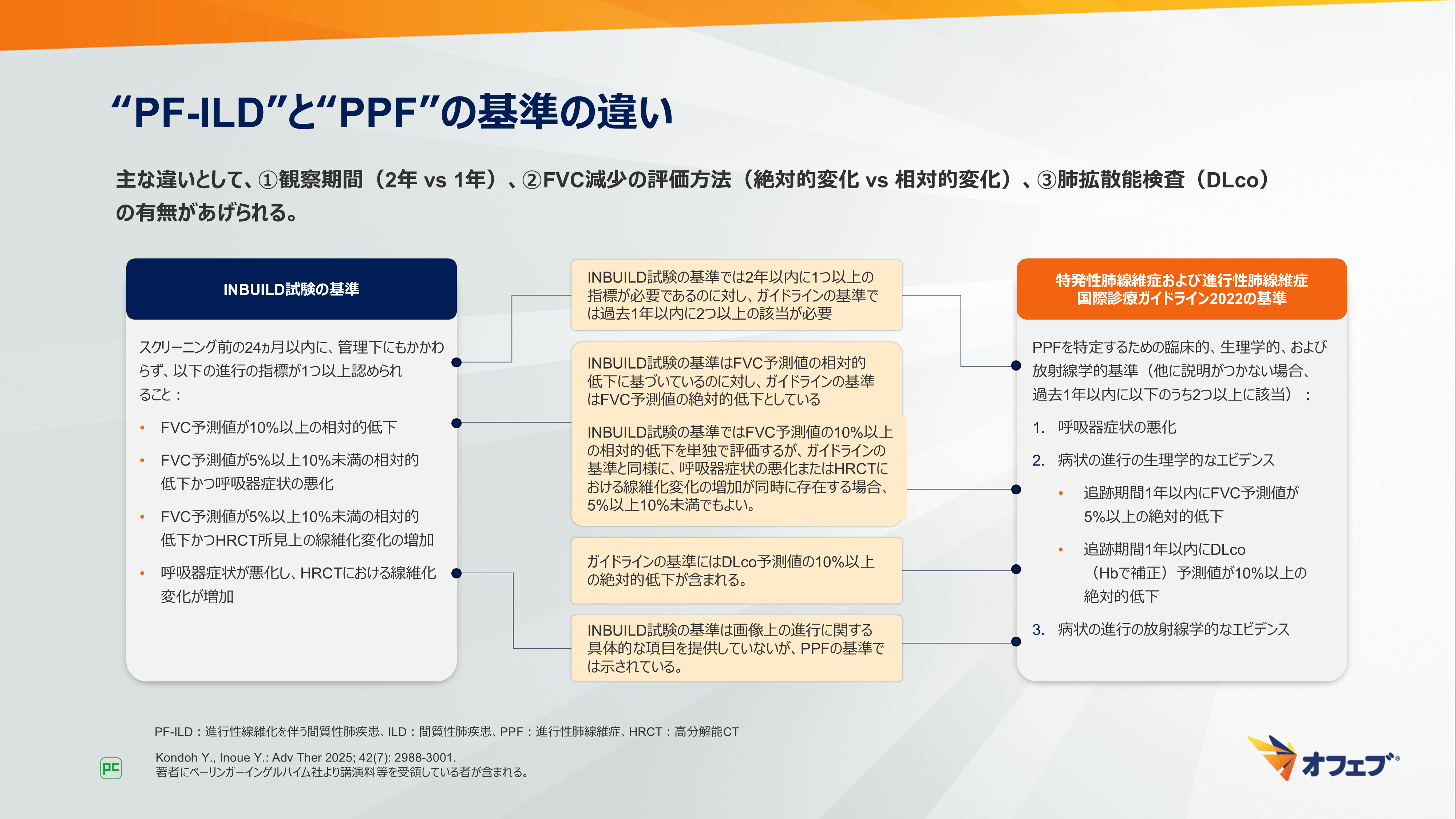 INBUILD試験で用いられた“PF-ILD”と、ガイドラインで提案された“PPF”の基準の違いについて示します(図5)。