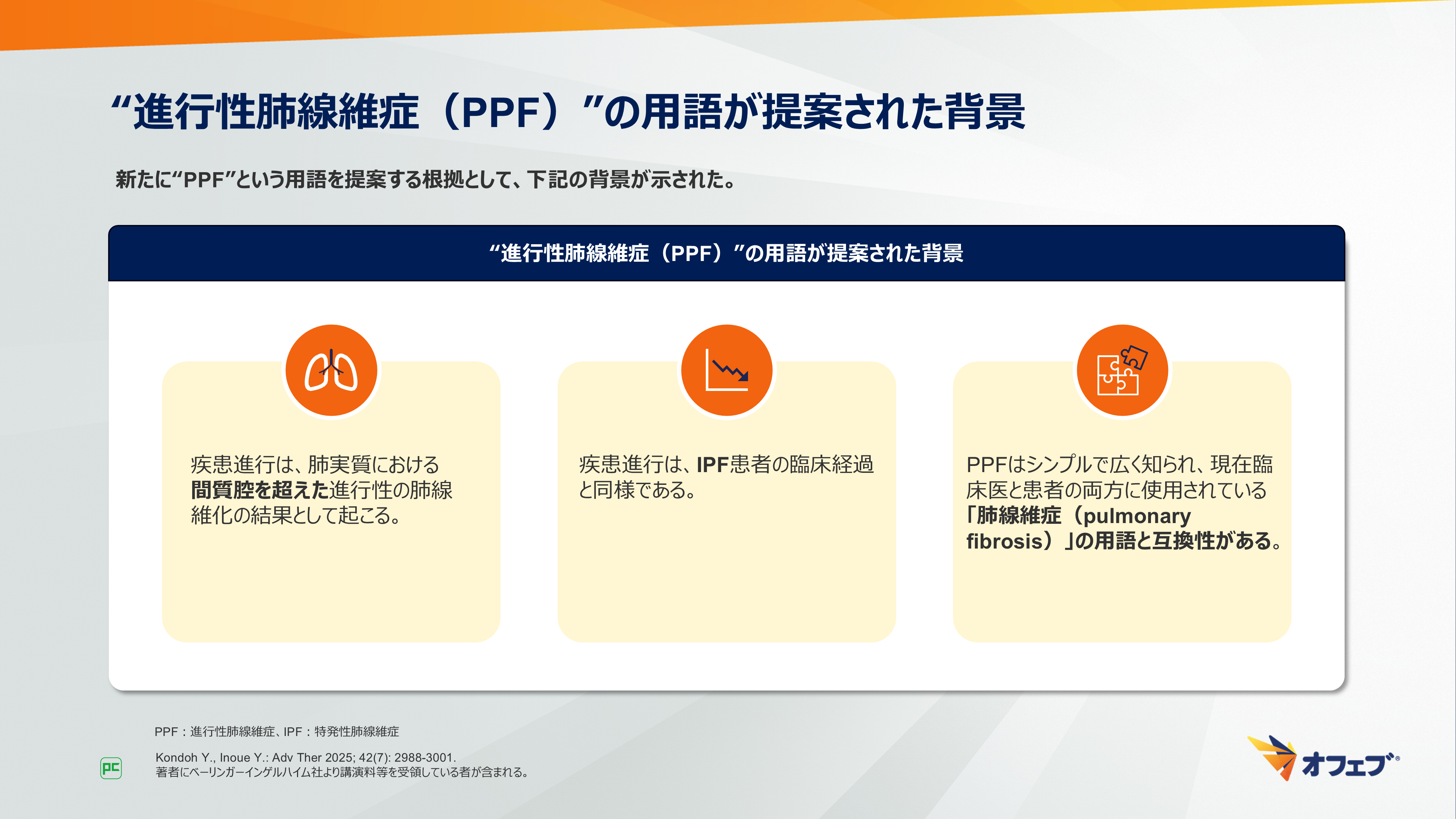 そのため、“PPF”という用語は、IPFに似た「疾患挙動(disease behavior)」を指す包括的な用語(umbrella term)として受け入れられるようになってきました。