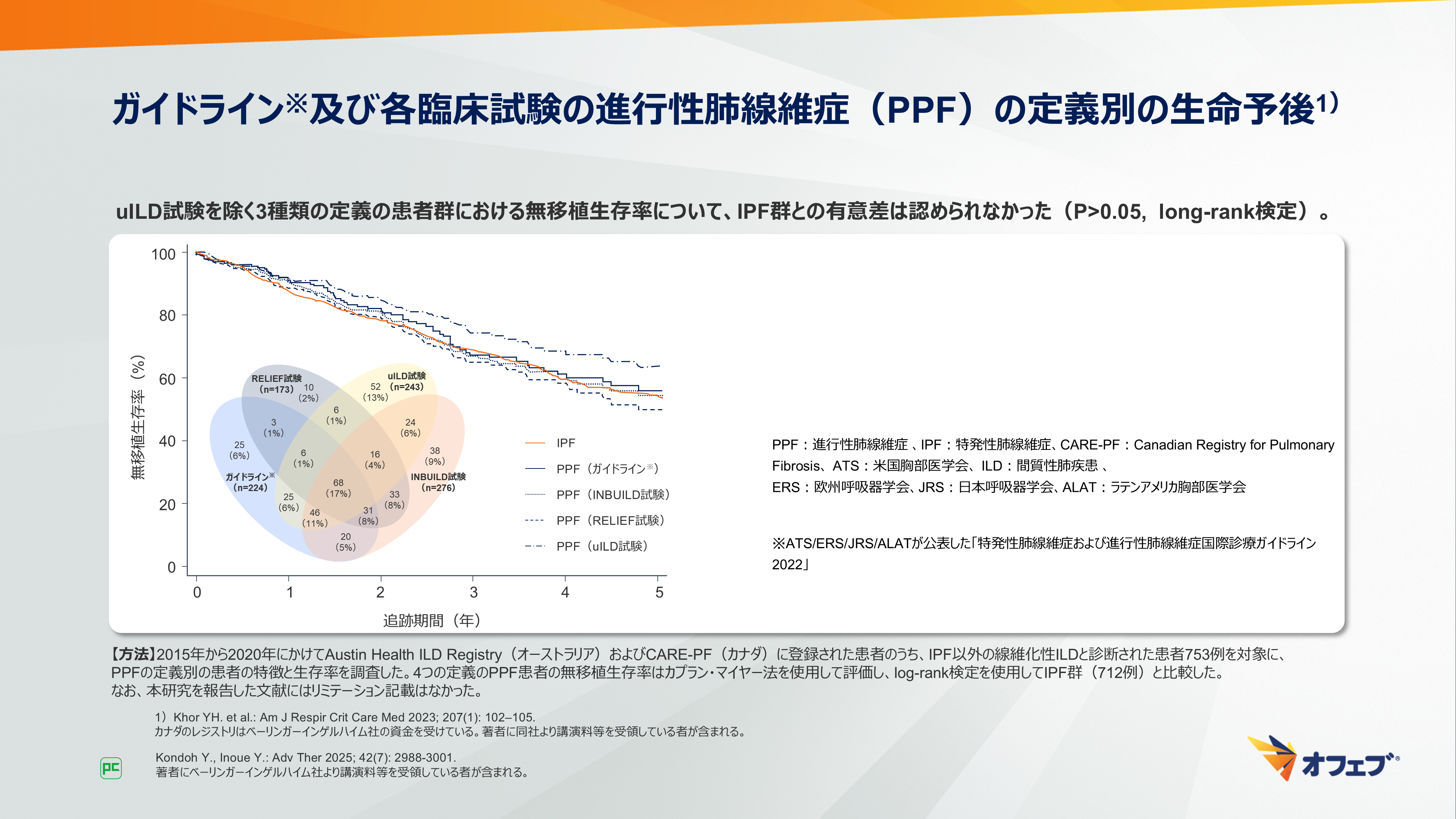 - Khor YH. et al.: Am J Respir Crit Care Med 2023; 207(1): 102–105. カナダのレジストリはベーリンガーインゲルハイム社の資金を受けている。著者に同社より講演料等を受領している者が含まれる。