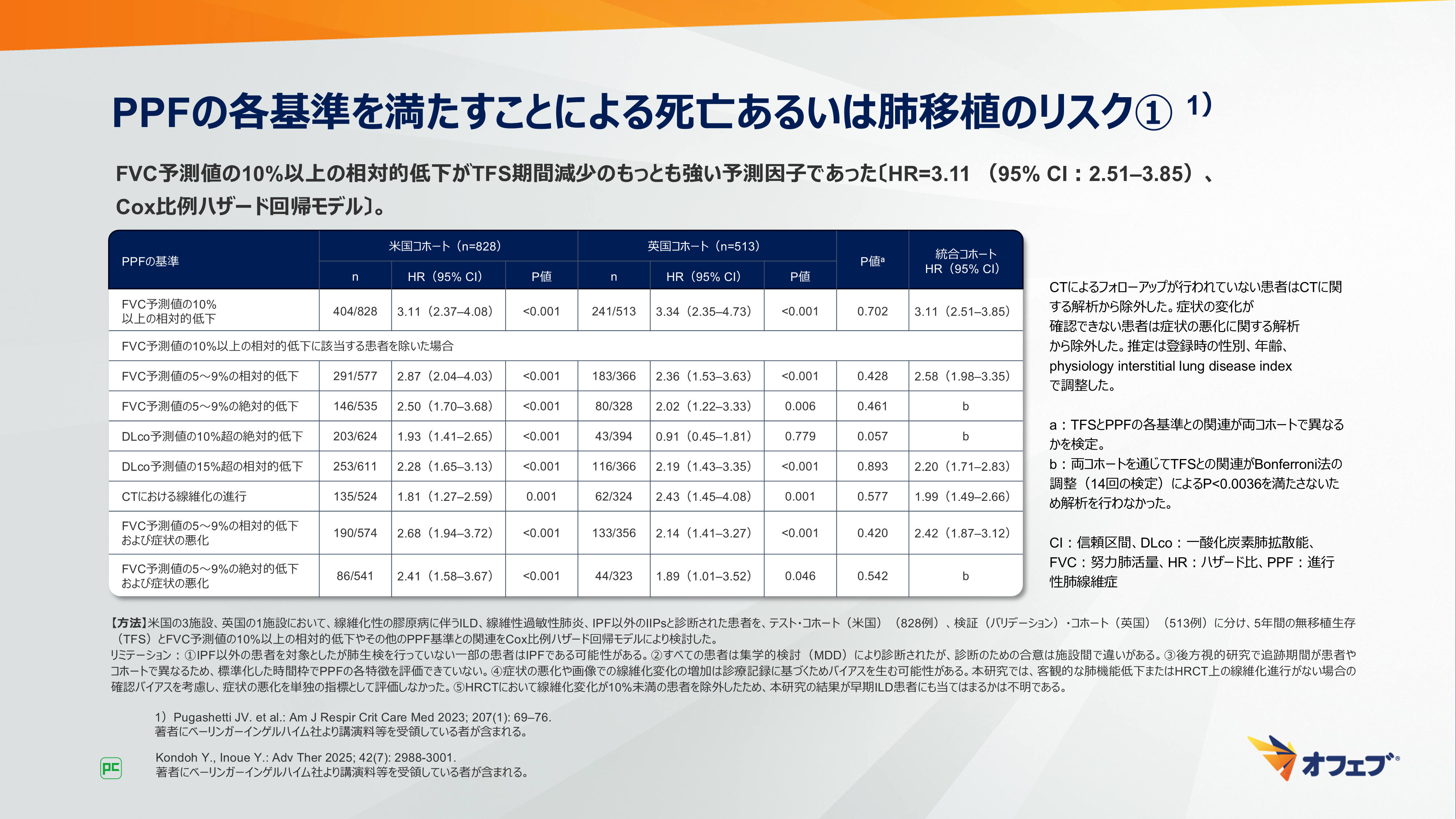 “PPF”は、過去1年以内に以下の臨床的、生理学的、および放射線学的基準のうち2つ以上に該当する場合と定義されています。これらの基準とは、