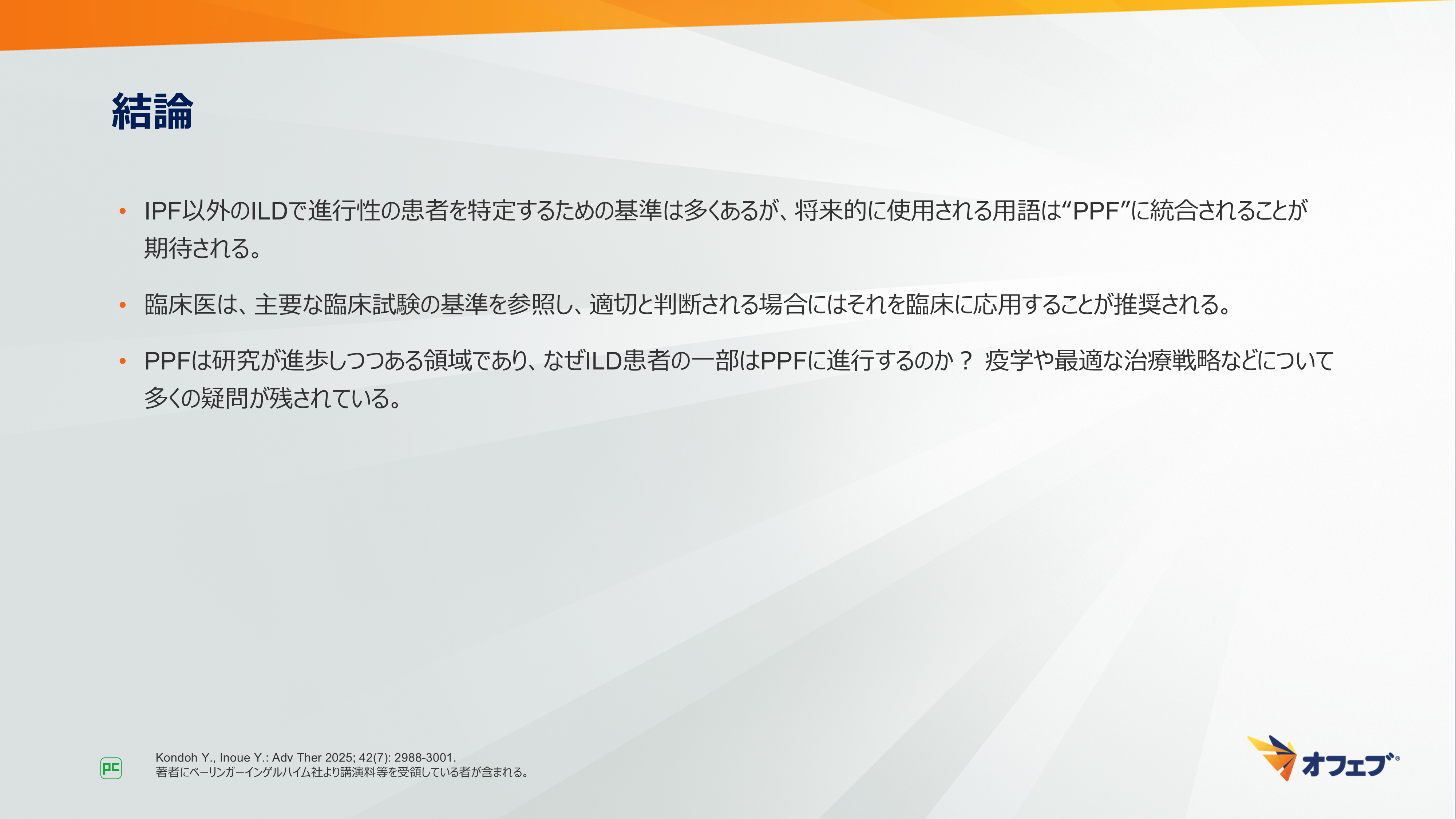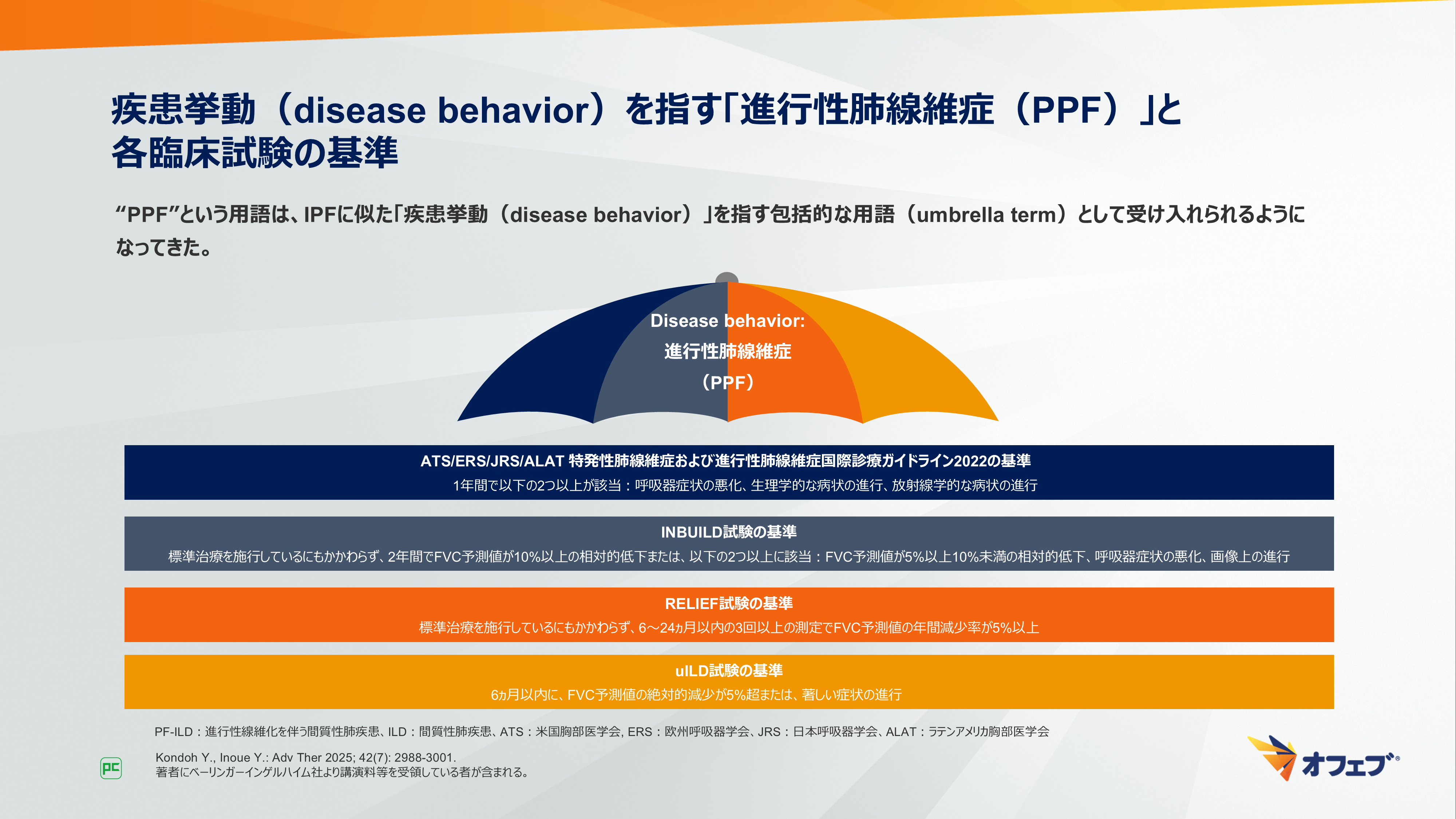 - 非IPFのILDで進行性の患者を特定するための基準は多くありますが、将来的に使用される用語は“PPF”に統合されることが期待されます。