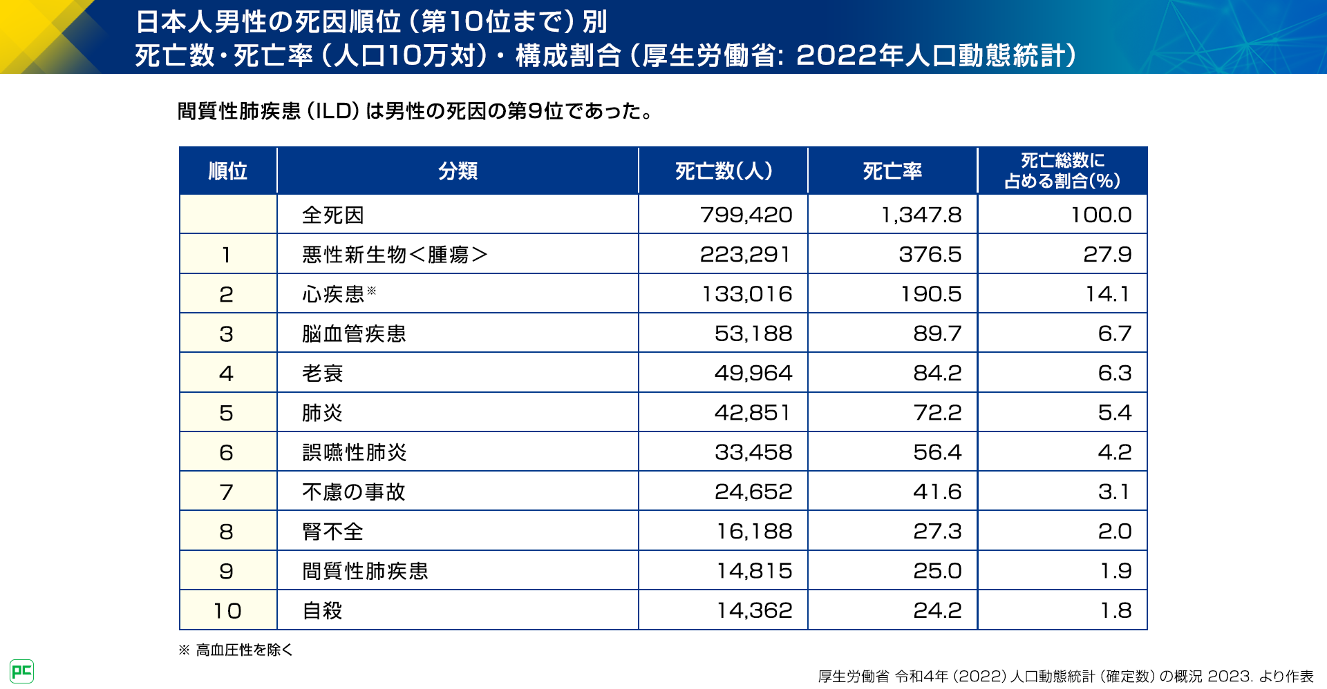厚生労働省の2022年人口動態統計では、ILDで亡くなった男性は14,815人で、日本人男性の死因の第9位でした(図1)。