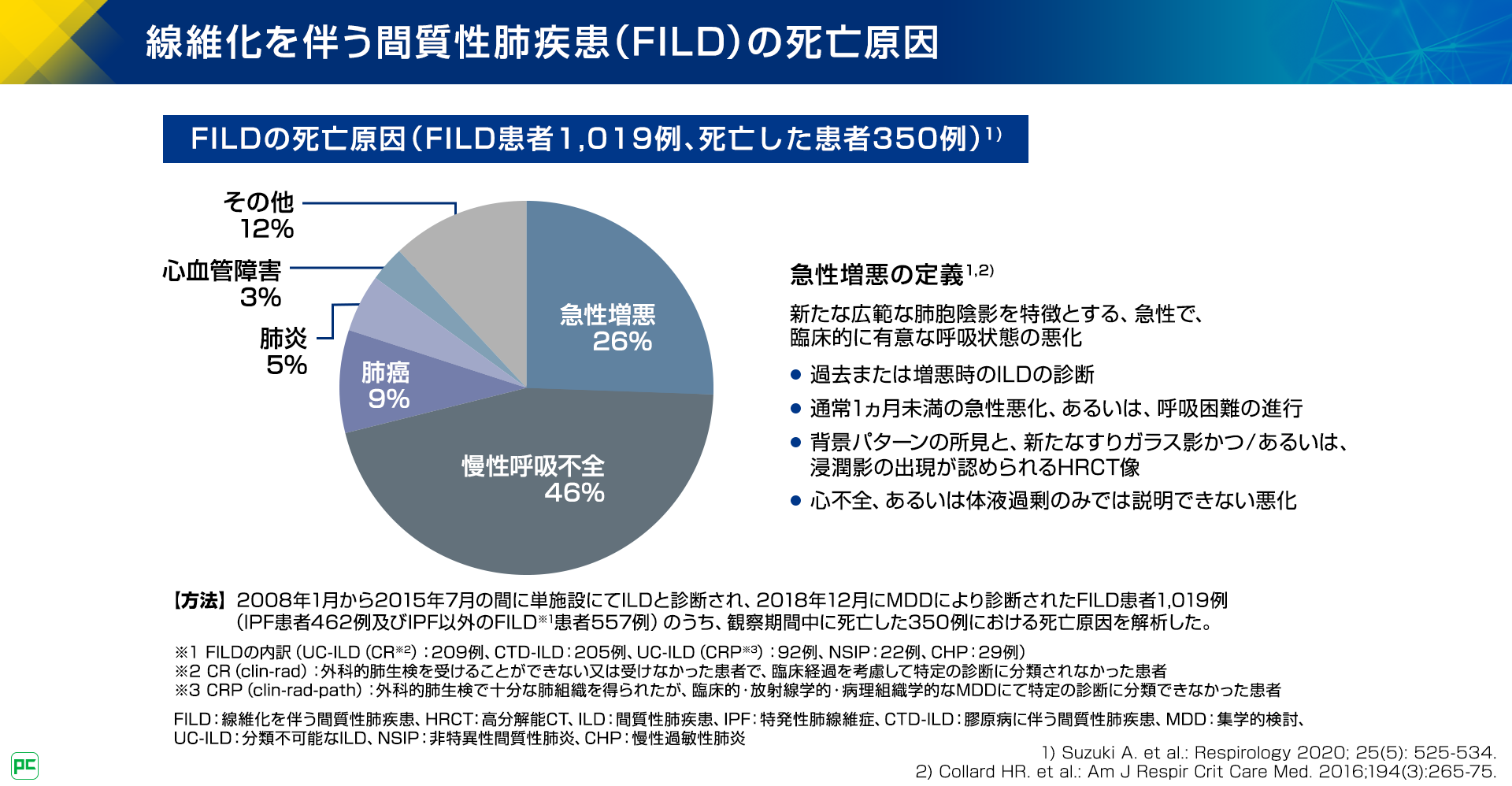 一部のCTD-ILDを含むPF-ILD診療においては、呼吸機能の低下を防ぐことに加え、ILDの急性増悪を防ぐことが患者さんの予後改善において重要です。