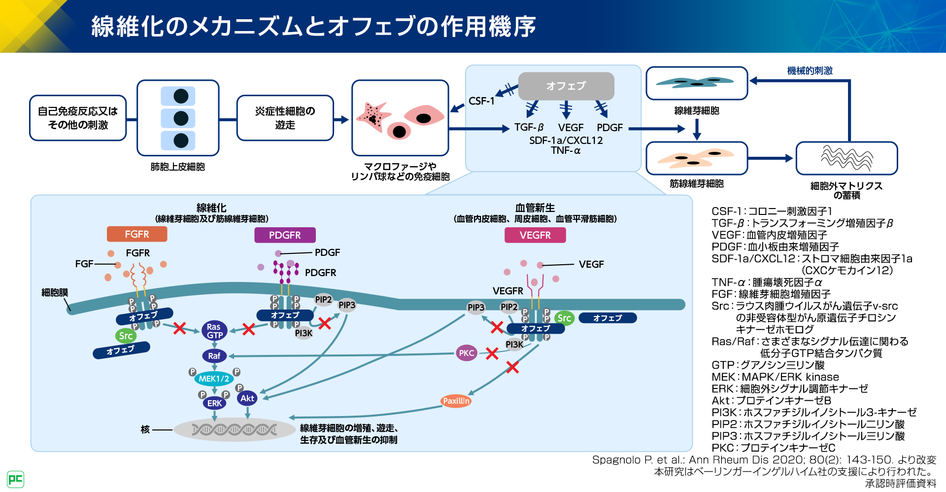 抗線維化剤オフェブは、これらの増殖因子を介したシグナル伝達を阻害し、線維芽細胞の増殖、遊走、生存及び血管新生を抑制することで抗線維化作用を示すと考えられています(図6)。