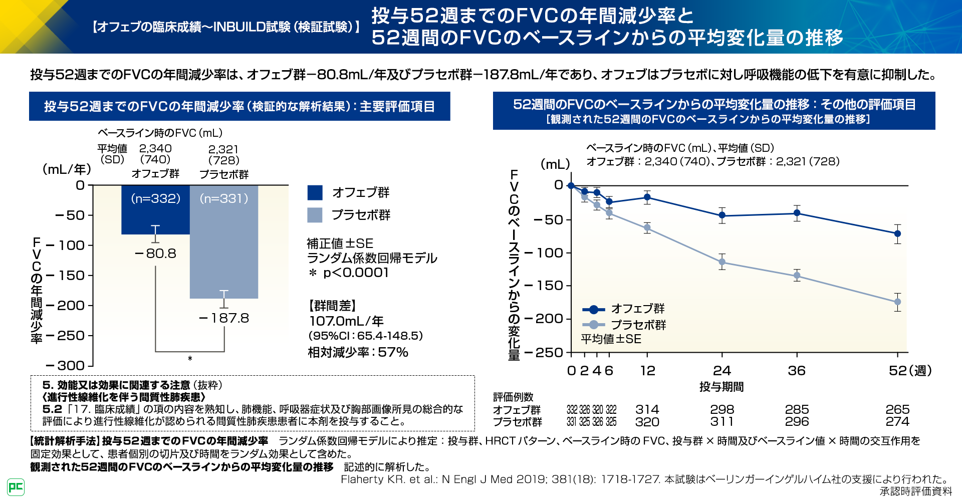本試験の結果、オフェブ群とプラセボ群の投与52週までのFVCの年間減少率には有意な差が認められ、オフェブによる呼吸機能低下の抑制効果が示されました。