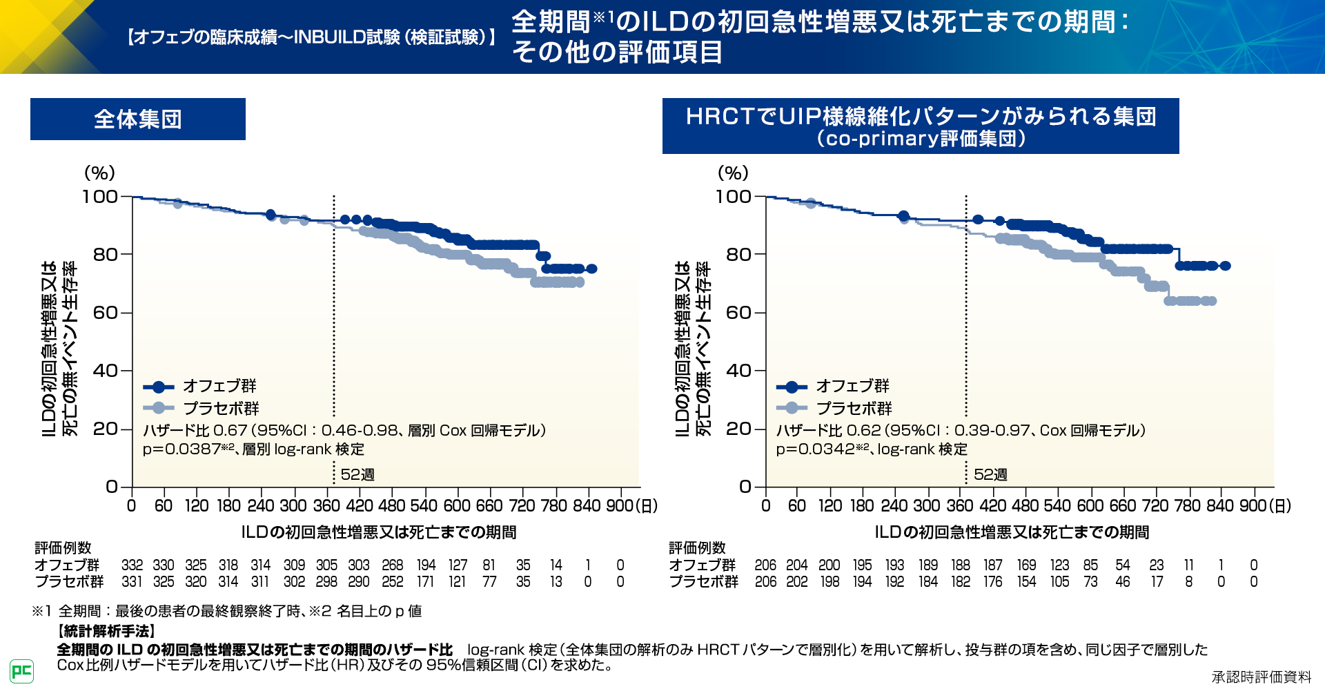 全期間のILDの初回急性増悪又は死亡までの期間について、全体集団を対象とした解析におけるハザード比は0.67であり、プラセボ群に対しオフェブ群で有意な改善が認められました。
