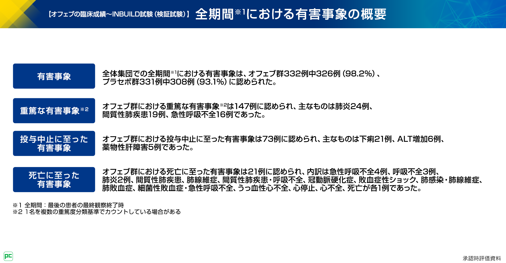 本試験の全期間における有害事象は、オフェブ群で326例(98.2%)、プラセボ群で308例(93.1%)に認められました。オフェブ群における重篤な有害事象として主なものは肺炎24例、間質性肺疾患19例、急性呼吸不全16例などでした。オフェブ群において投与中止に至った有害事象は下痢21例、ALT増加6例、薬物性肝障害5例などであり、死亡に至った有害事象は、急性呼吸不全4例、呼吸不全3例などでした(図11)。