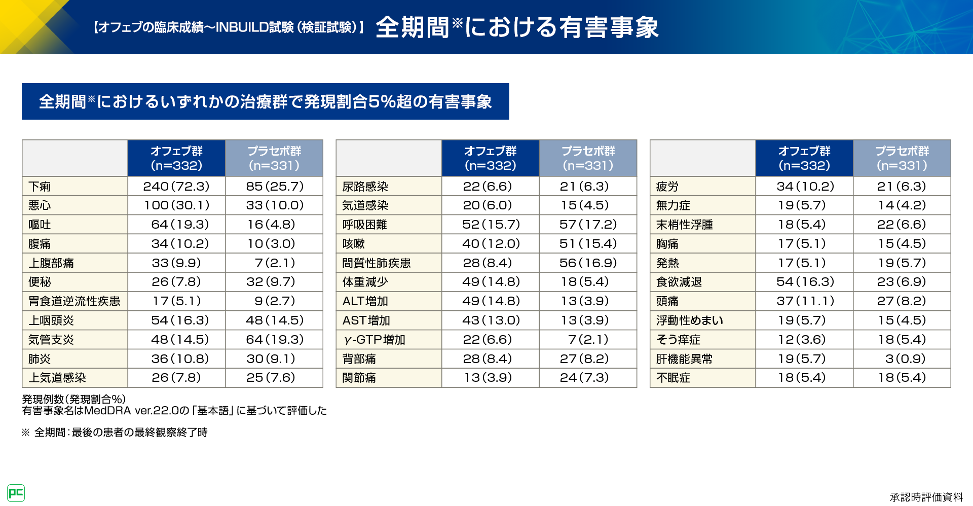 主な有害事象は、発現頻度が高い順にオフェブ群で下痢240例(72.3%)、悪心100例(30.1%)、嘔吐64例(19.3%)など、プラセボ群で下痢85例(25.7%)、気管支炎64例(19.3%)、呼吸困難57例(17.2%)などでした(図12)。