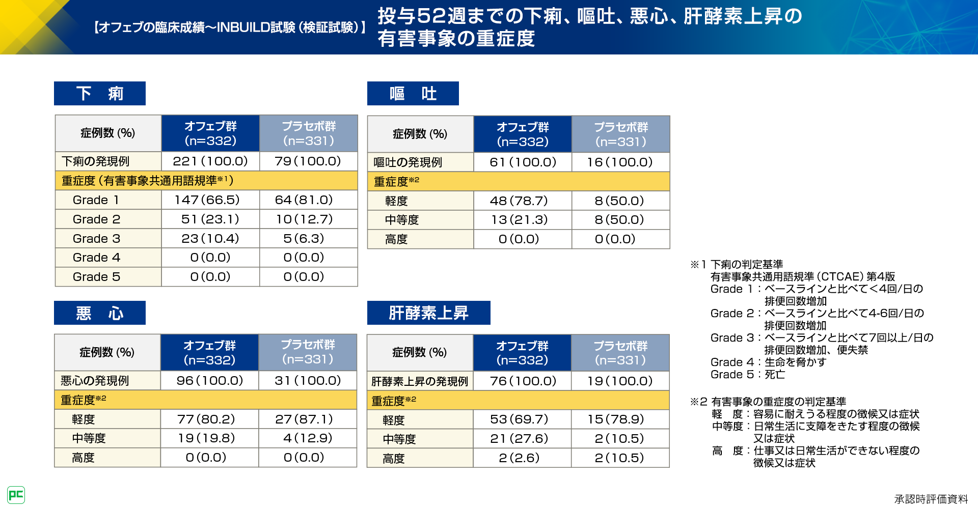 続いて、投与52週までの下痢、嘔吐、悪心、肝酵素上昇の有害事象の重症度をお示しします。オフェブ群において、下痢は、有害事象共通用語規準を用いた評価ではGrade 1 が66.5%、Grade 2 が23.1%、Grade 3 が10.4%でした。嘔吐と悪心、肝酵素上昇は有害事象の重症度の判定基準を用いて評価しています。嘔吐は軽度が78.7%、中等度が21.3%、悪心は軽度が80.2%、中等度が19.8%でした。肝酵素上昇は軽度が69.7%、中等度が27.6%、高度が2.6%でした(図13)。