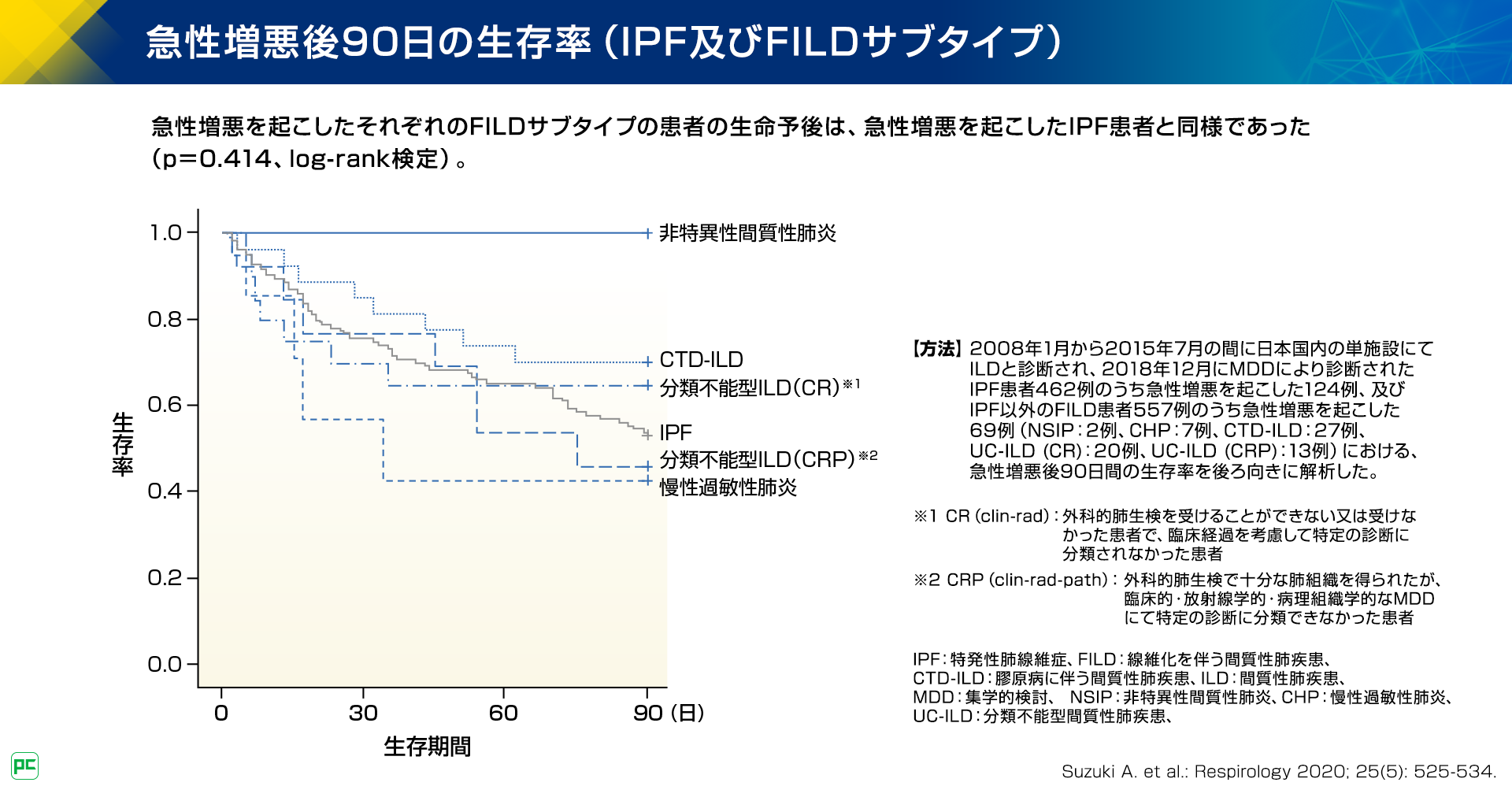以上の結果から、CTD-ILDを含むPF-ILDの診療においては、呼吸機能の低下を防ぐことに加え、ILDの急性増悪を防ぐことが、患者さんの予後改善において重要であると考えられます。