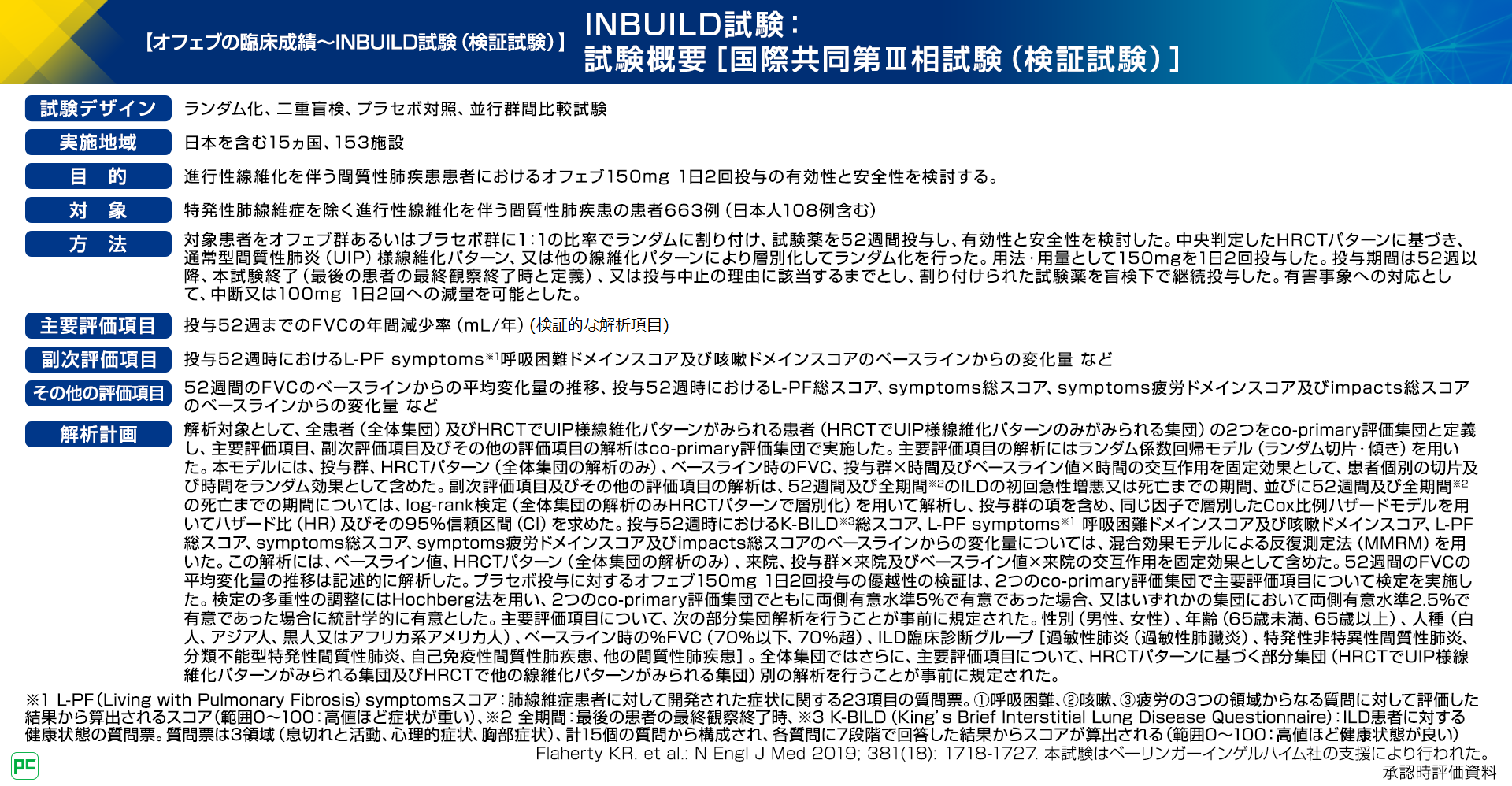 - Spagnolo P. et al.: Arthritis Rheumatol. 2018;70(10):1544-1554. 著者にベーリンガーインゲルハイム社よりコンサルタント料等を受領している者が含まれる。