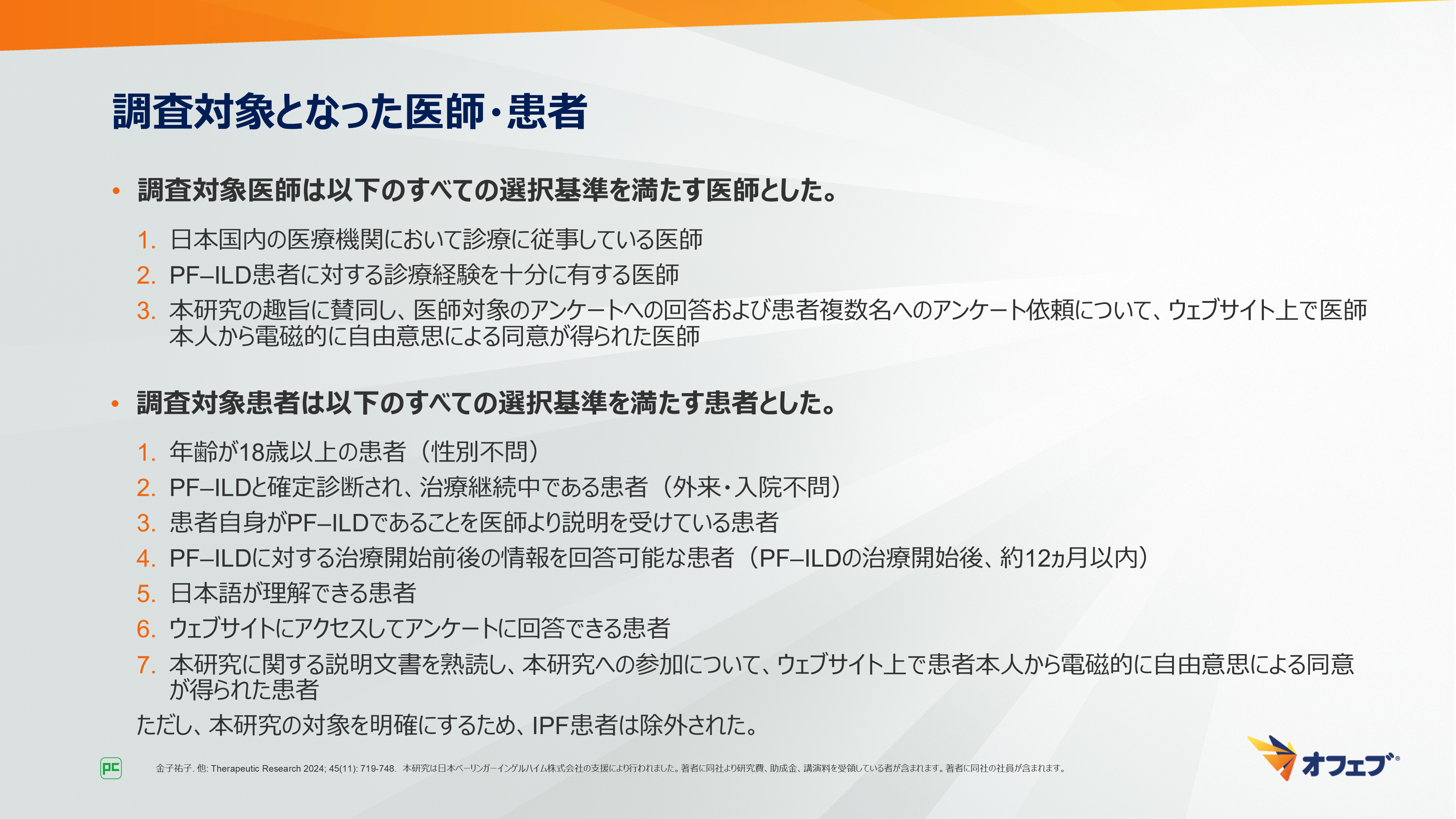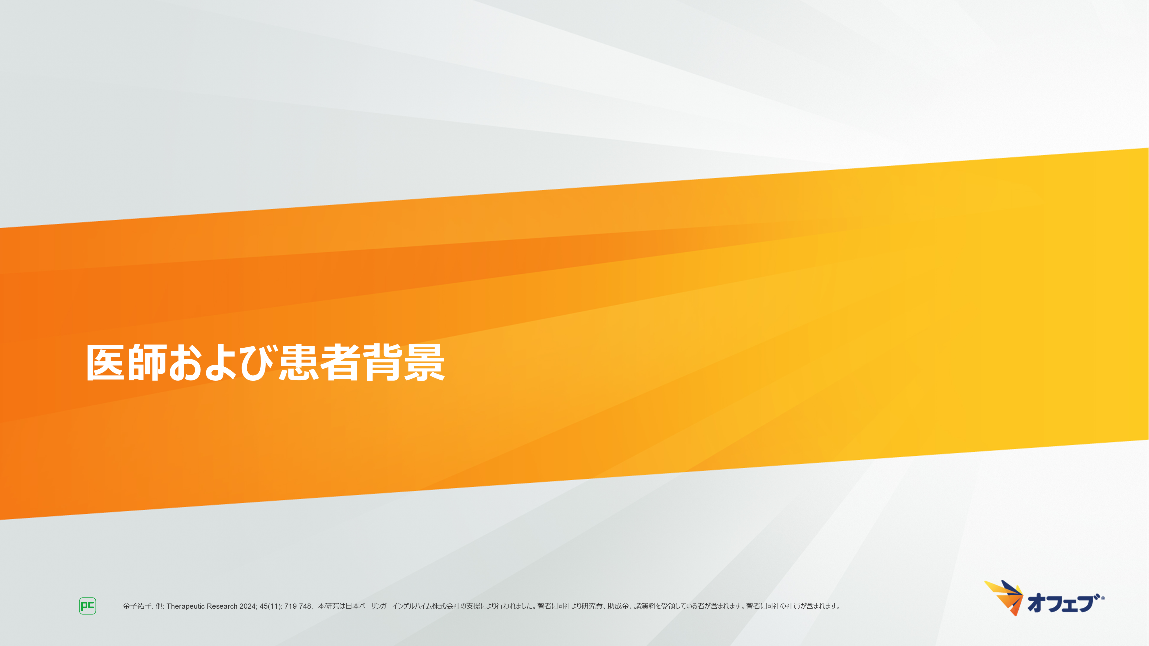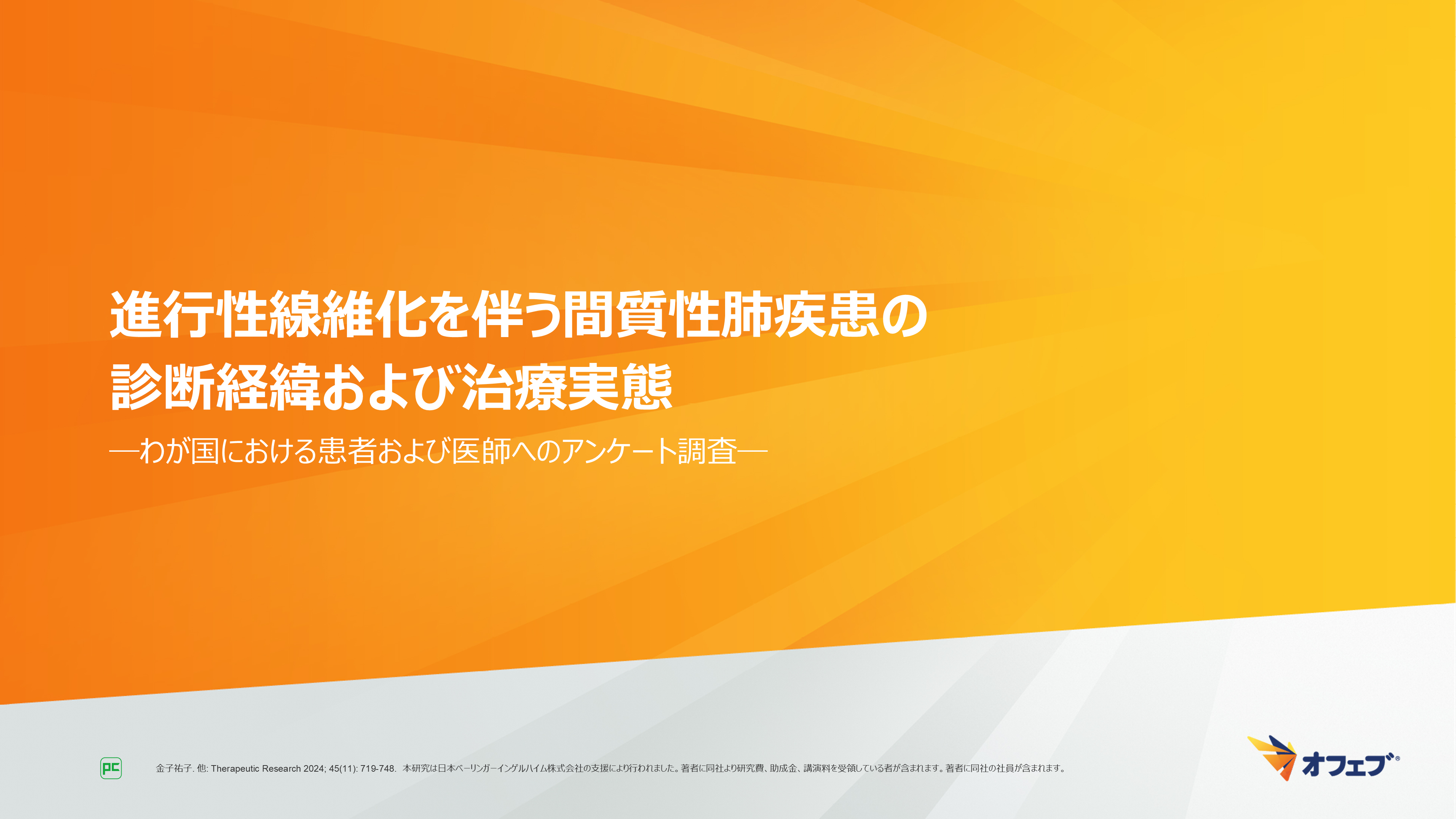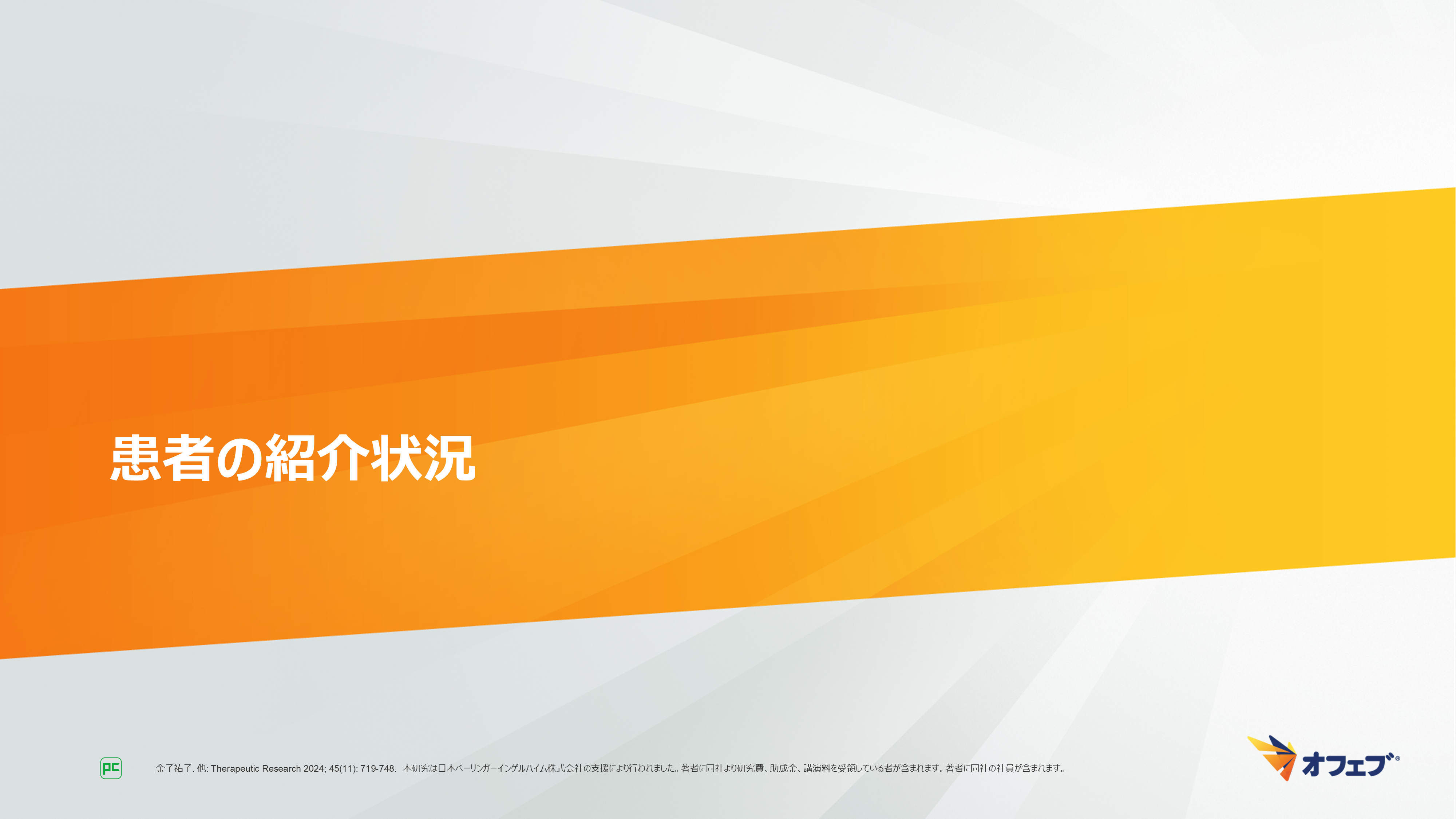 - 金子祐子. 他: Therapeutic Research 2024; 45(11): 719-748. 本研究は日本ベーリンガーインゲルハイム株式会社の支援により行われました。著者に同社より研究費、助成金、講演料を受領している者が含まれます。著者に同社の社員が含まれます。