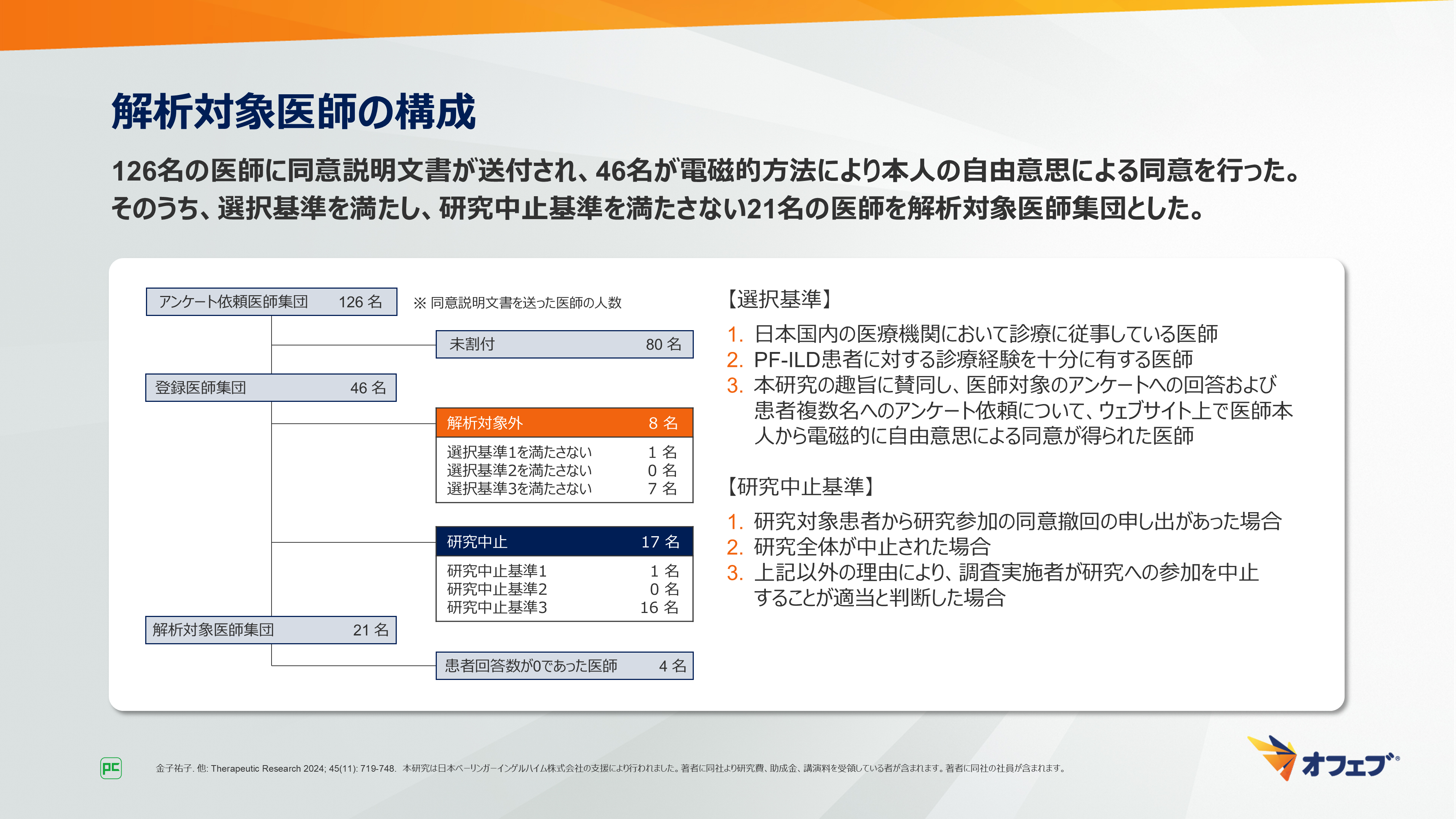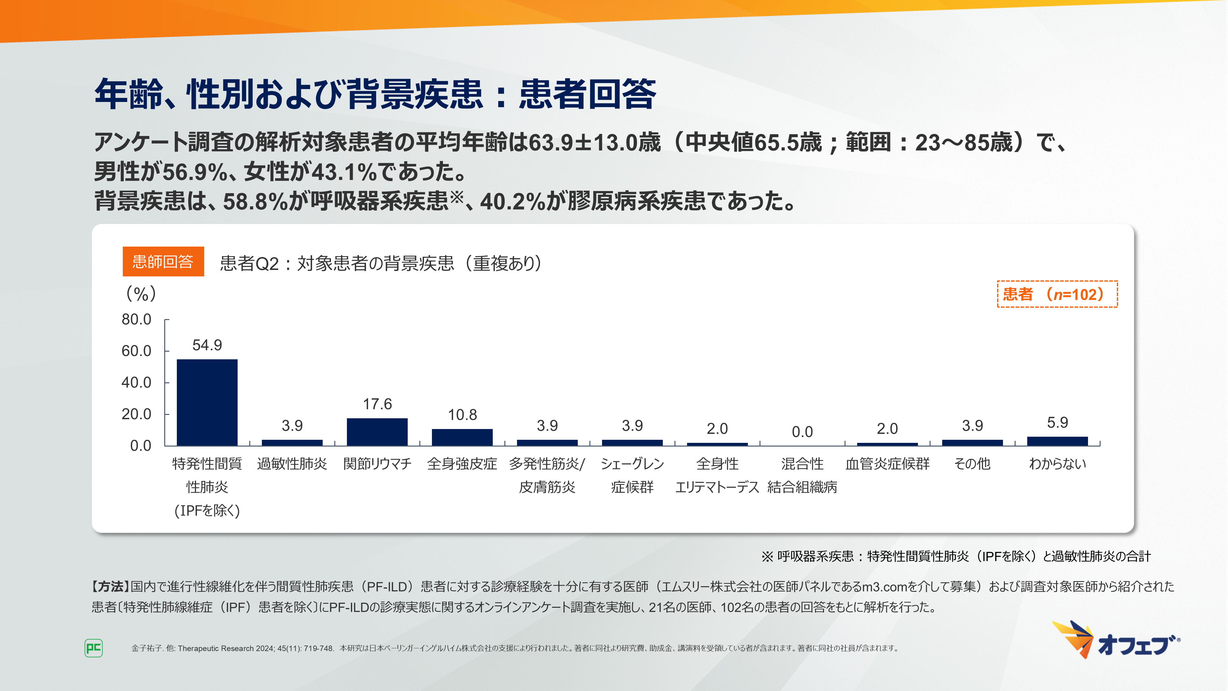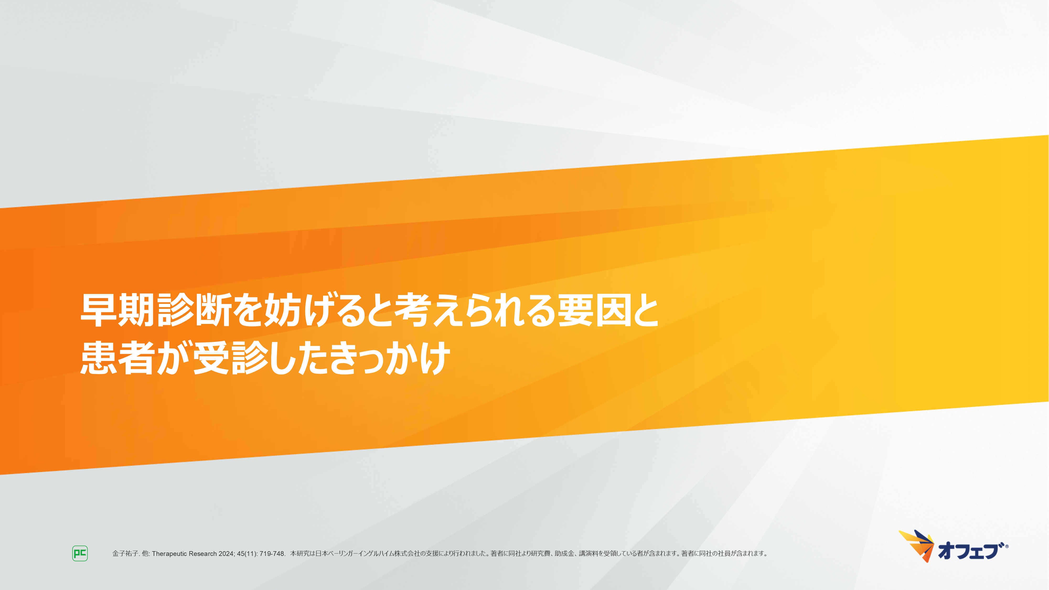 - 金子祐子. 他: Therapeutic Research 2024; 45(11): 719-748. 本研究は日本ベーリンガーインゲルハイム株式会社の支援により行われました。著者に同社より研究費、助成金、講演料を受領している者が含まれます。著者に同社の社員が含まれます。