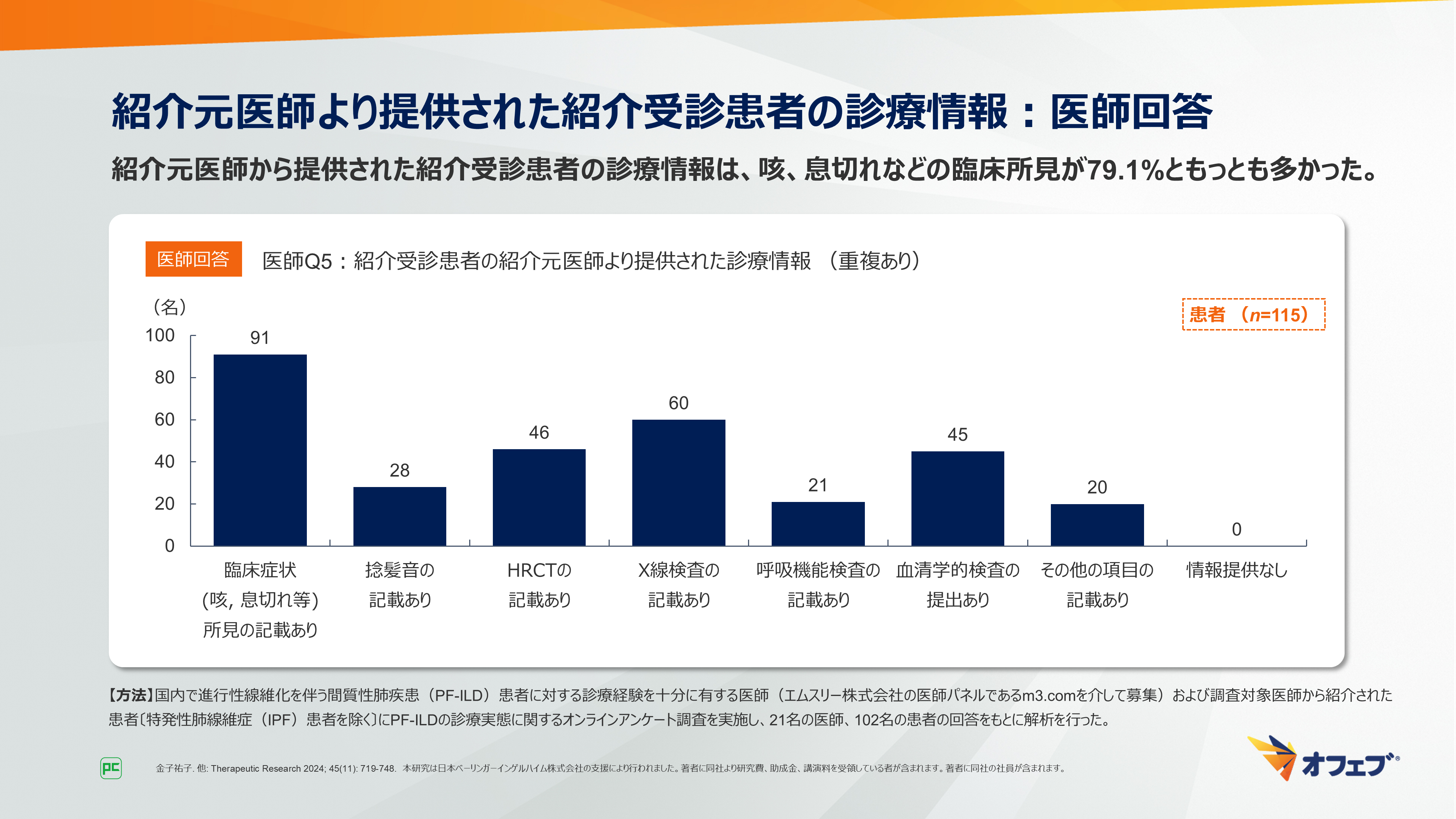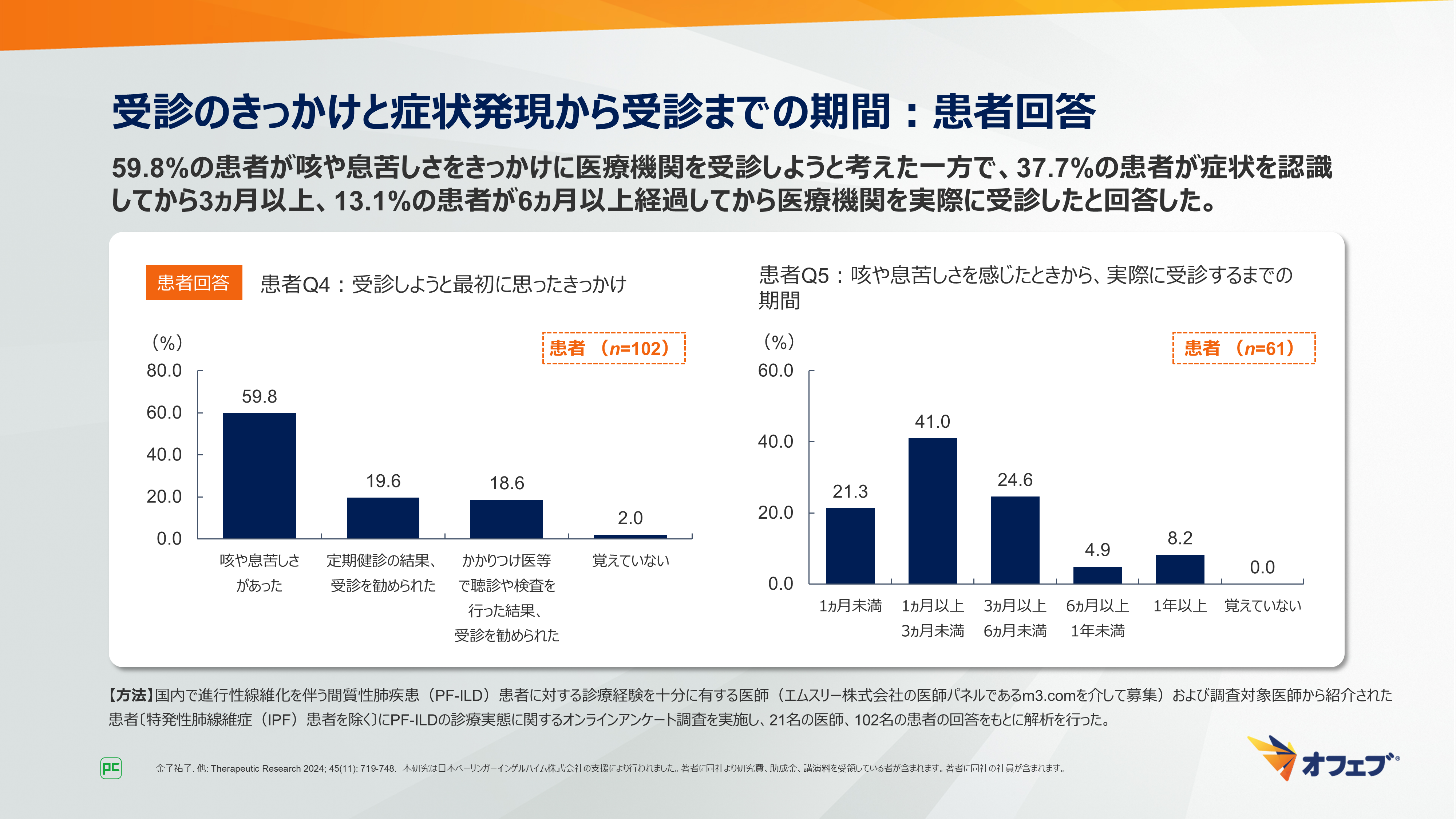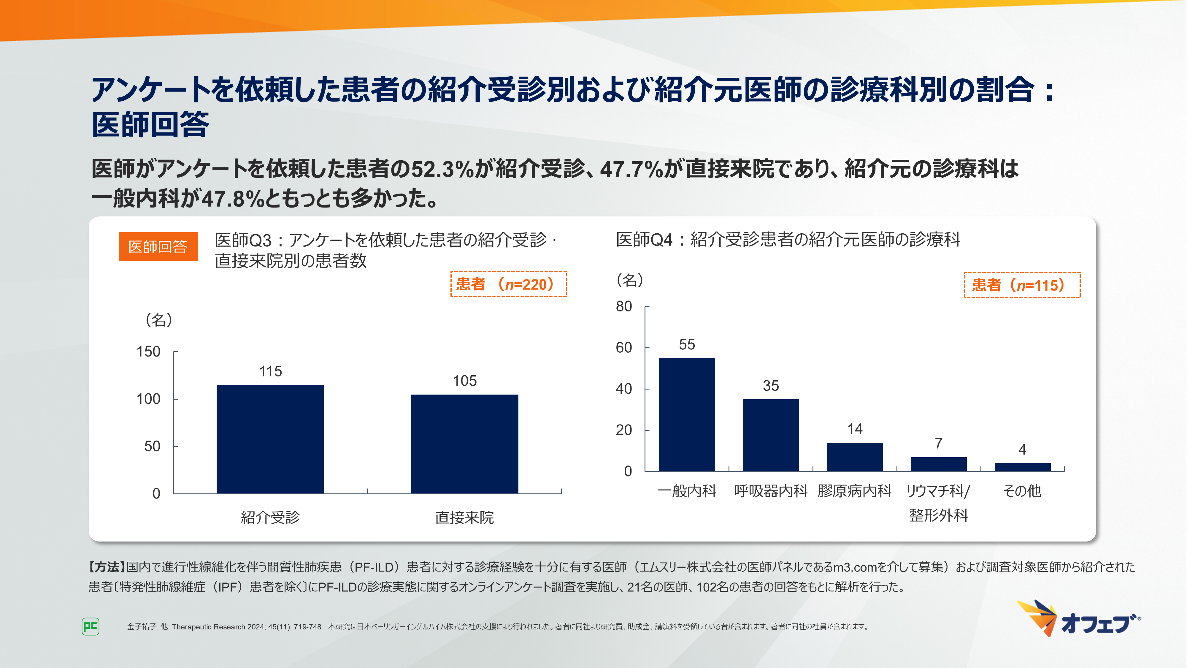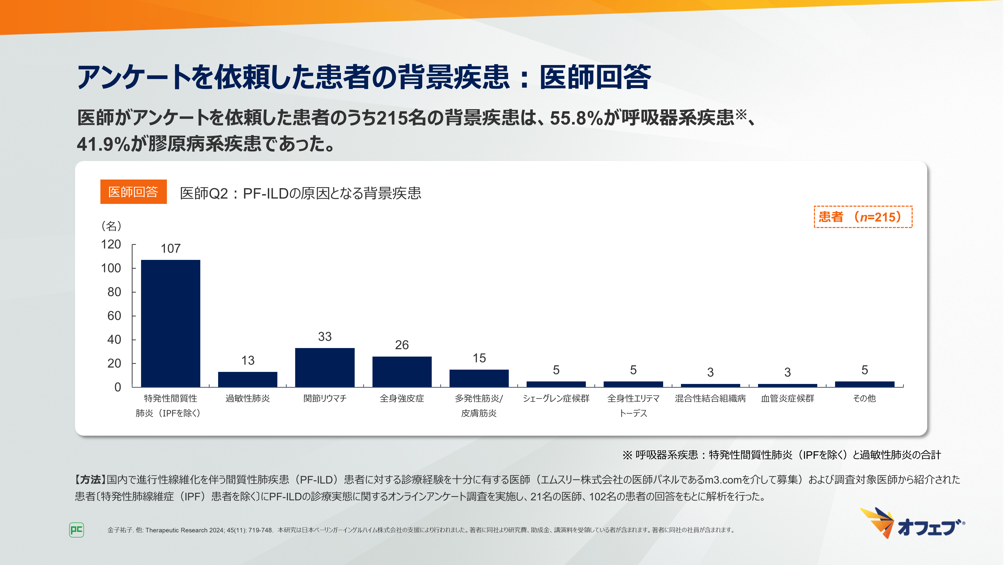 - 金子祐子. 他: Therapeutic Research 2024; 45(11): 719-748. 本研究は日本ベーリンガーインゲルハイム株式会社の支援により行われました。著者に同社より研究費、助成金、講演料を受領している者が含まれます。著者に同社の社員が含まれます。