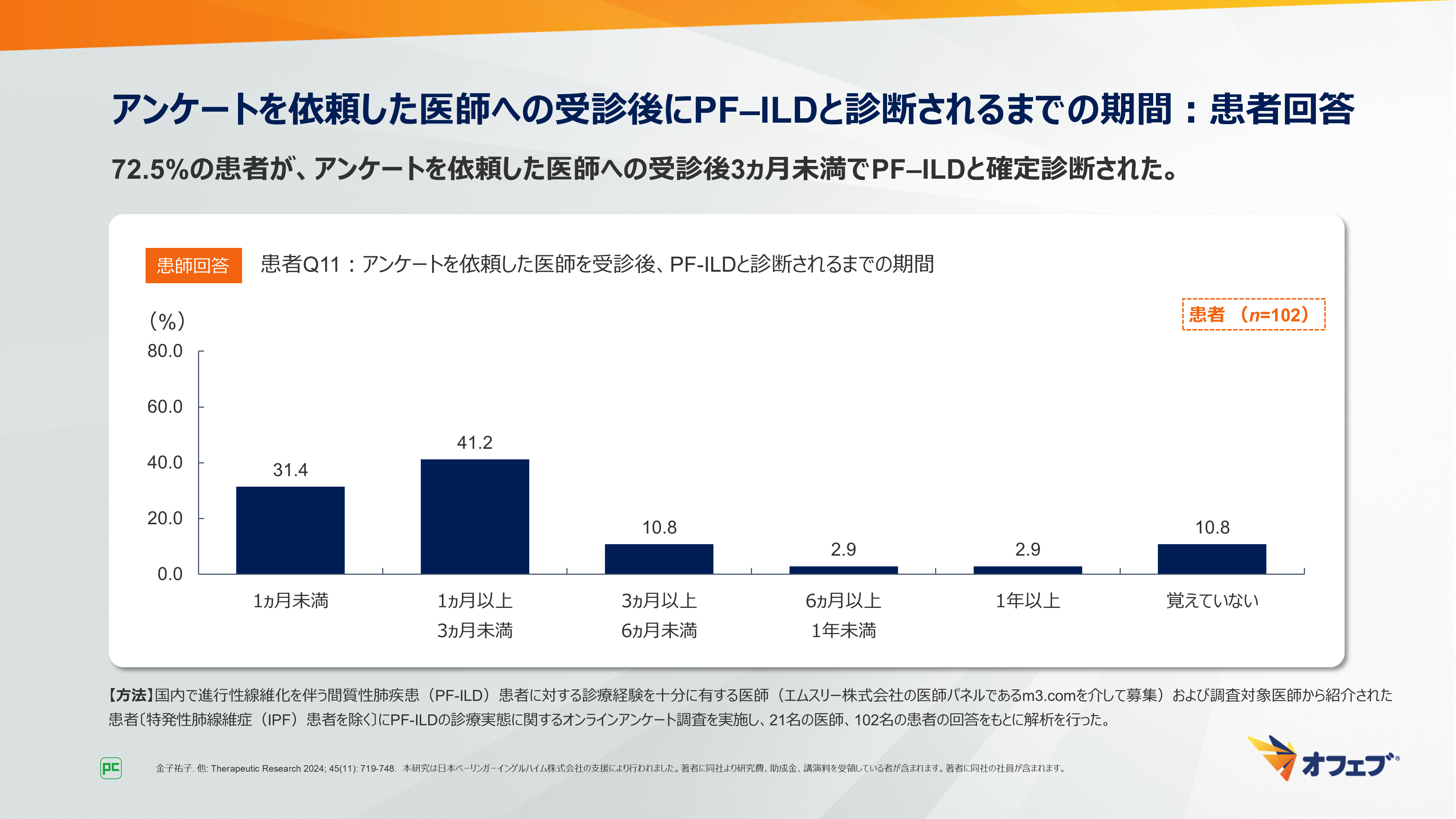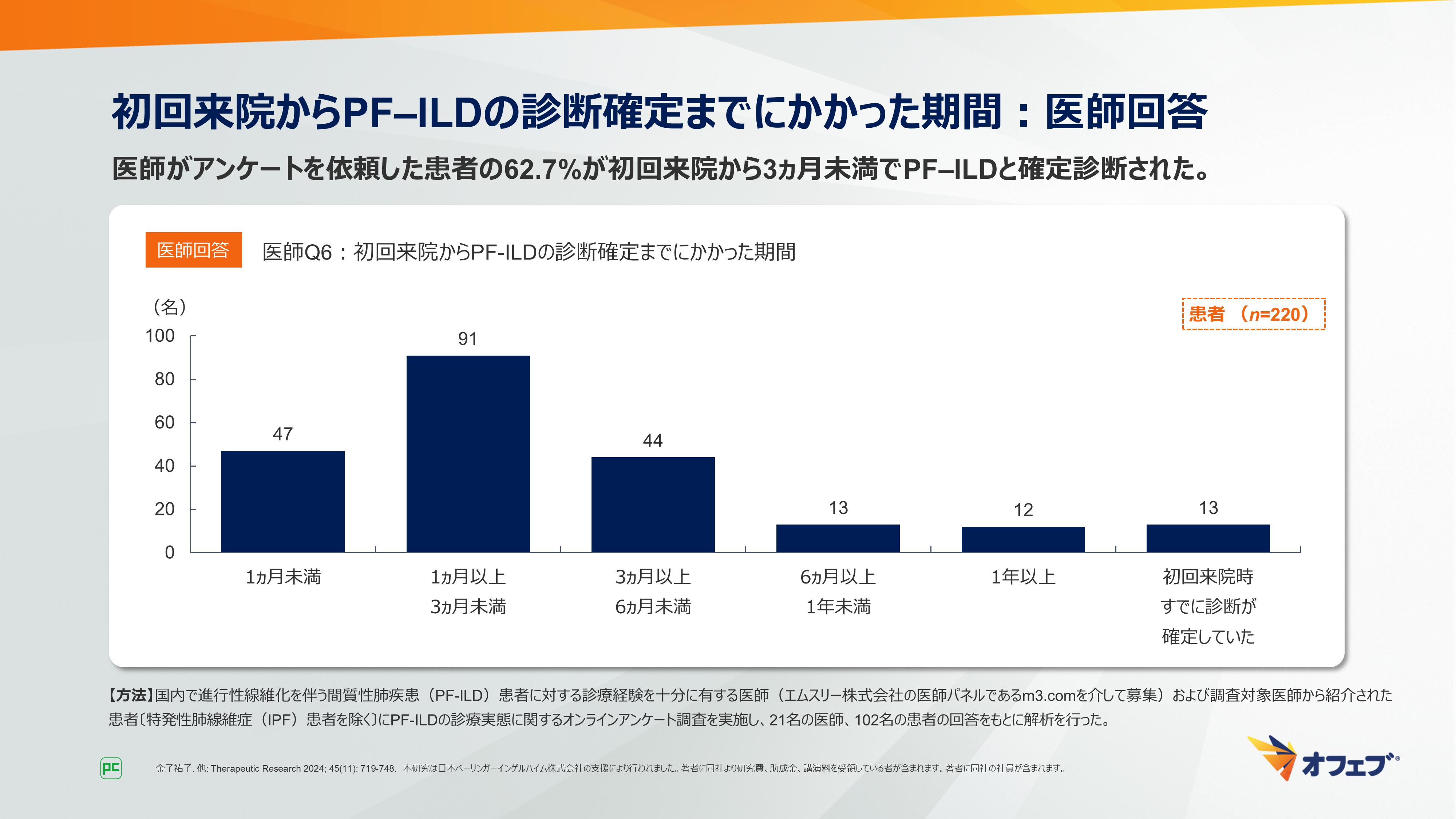 72.5%の患者が、アンケートを依頼した医師への受診後3ヵ月未満でPF‒ILDと確定診断されました(図13)。