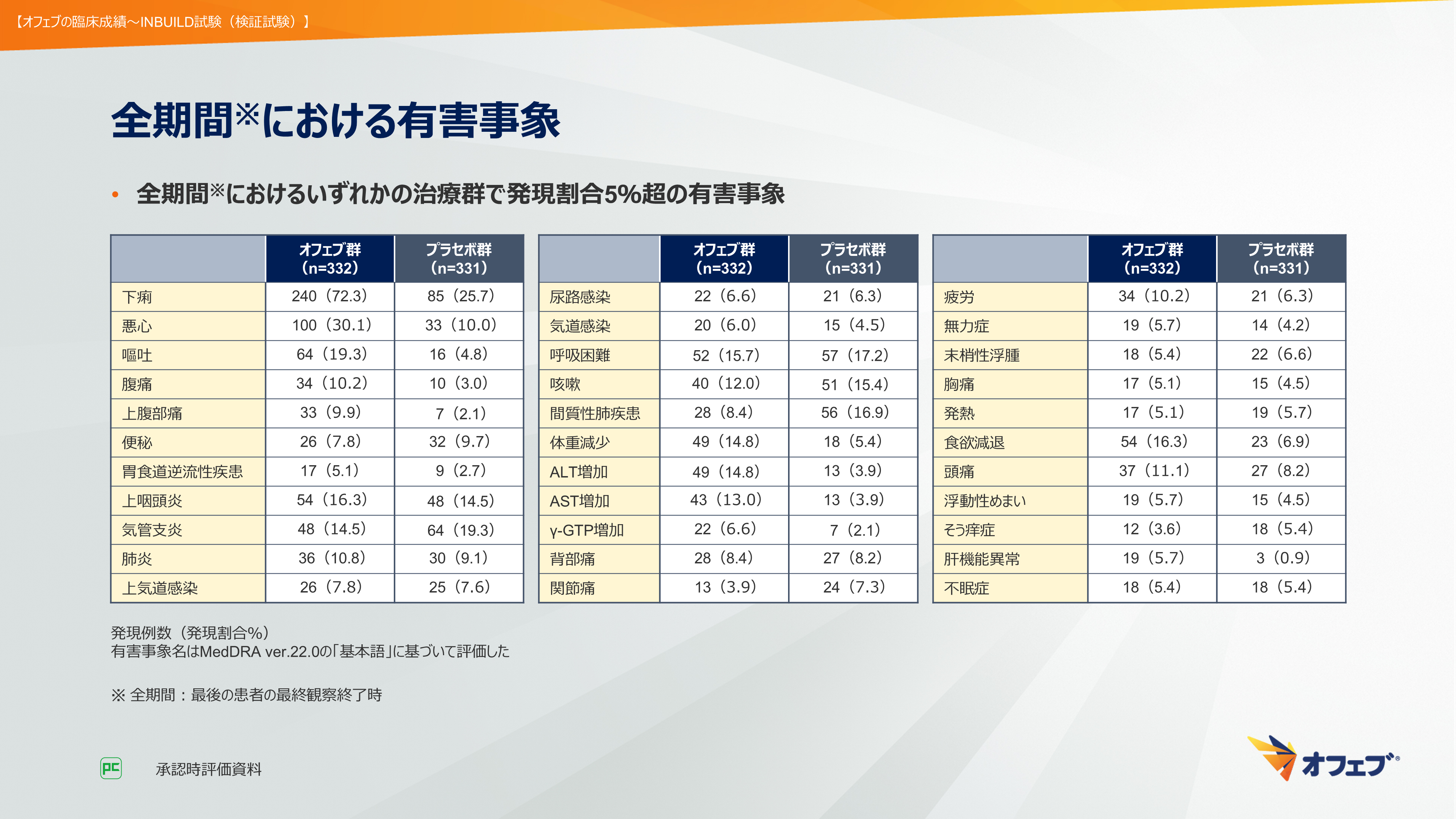 主な有害事象は、発現頻度が高い順にオフェブ群で下痢240例(72.3%)、悪心100例(30.1%)、嘔吐64例(19.3%)など、プラセボ群で下痢85例(25.7%)、気管支炎64例(19.3%)、呼吸困難57例(17.2%)などでした(図49)。
