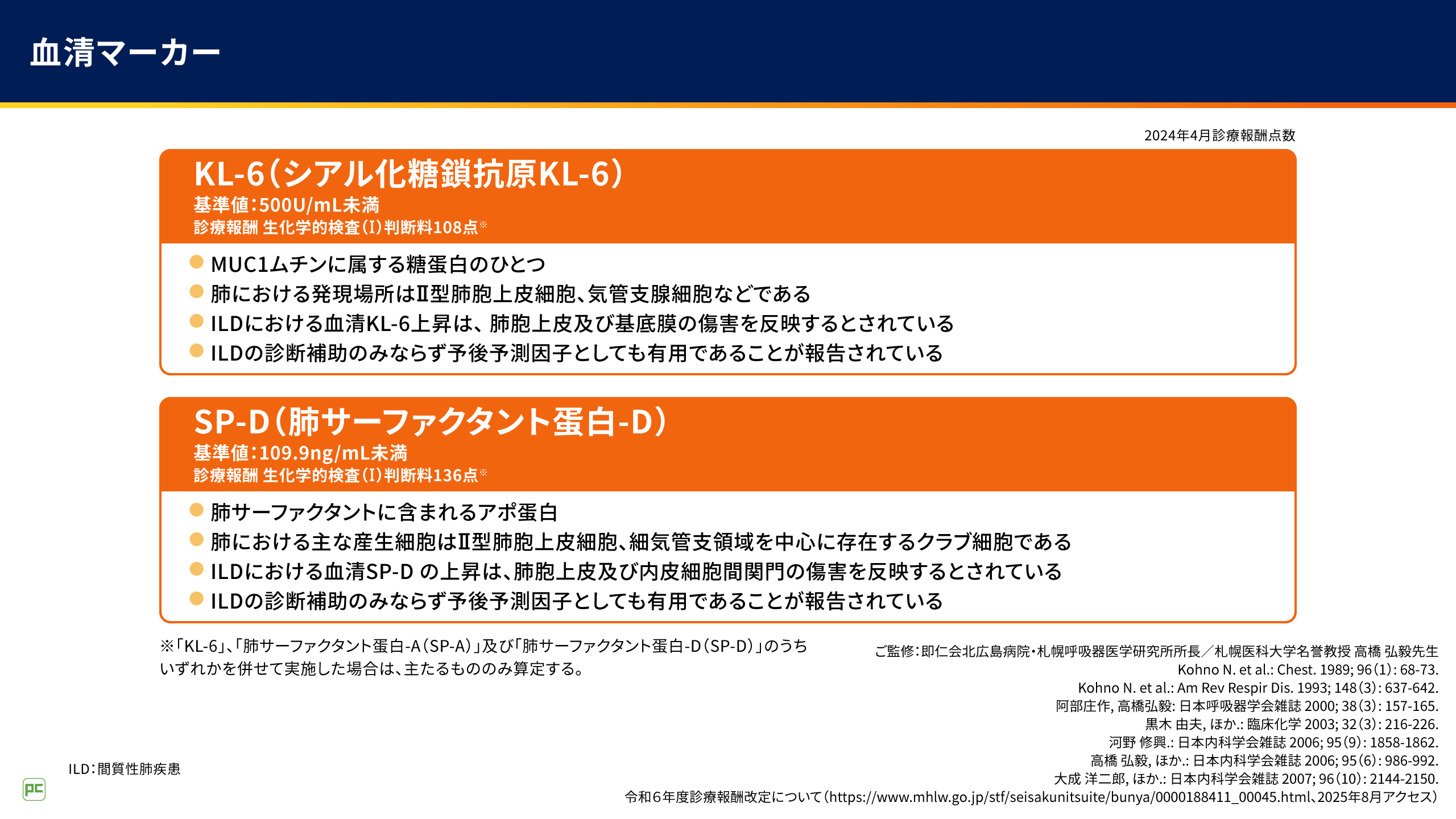 ILDの診断補助として、KL-6や肺サーファクタント蛋白-D(SP-D)が用いられています。