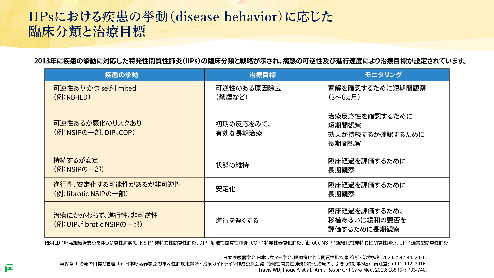 たとえばIPFと類似した、病態が進行性かつ非可逆性のIIPsの場合、IPFに準じて進行を遅くすることが治療目標となります。