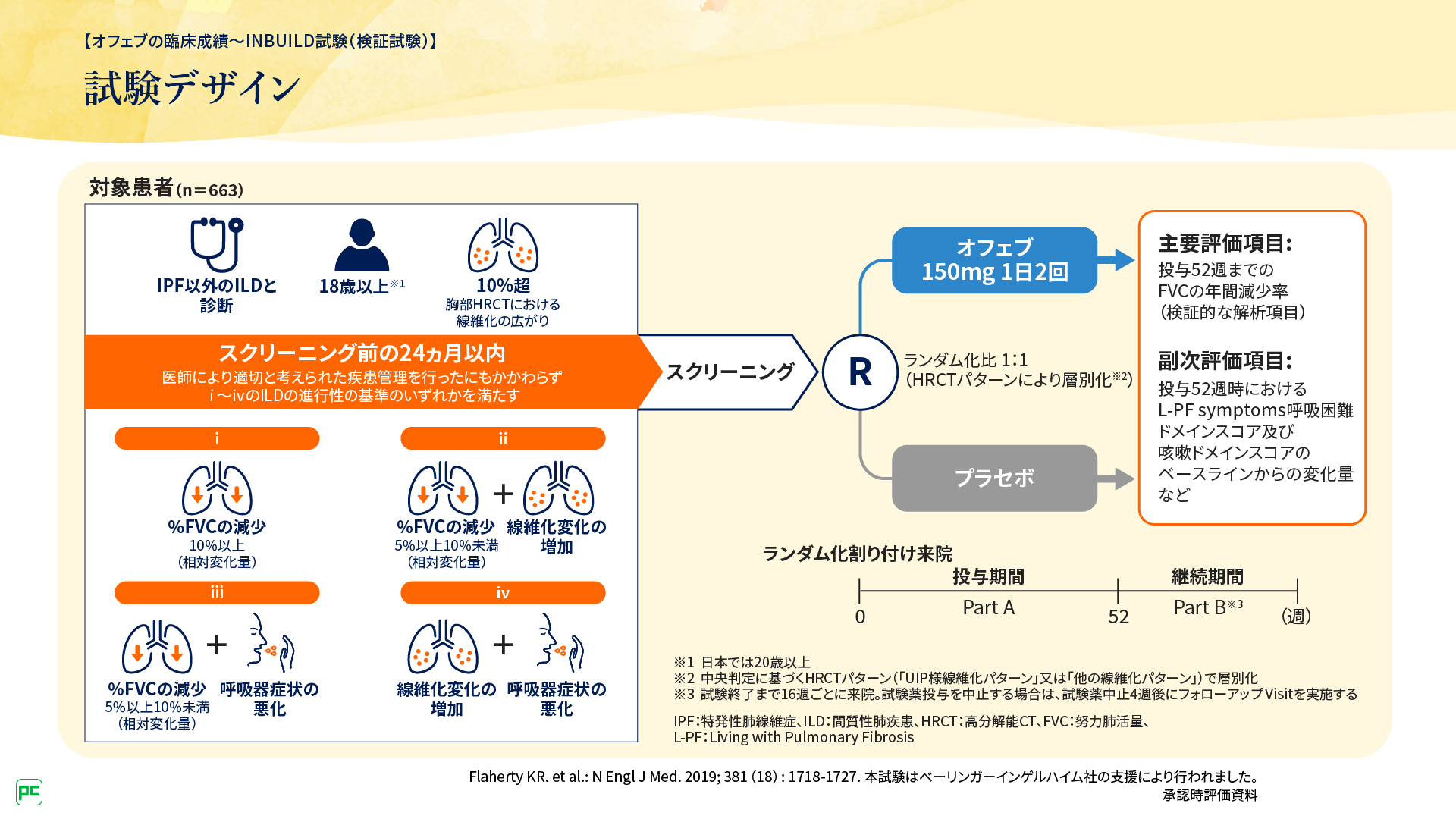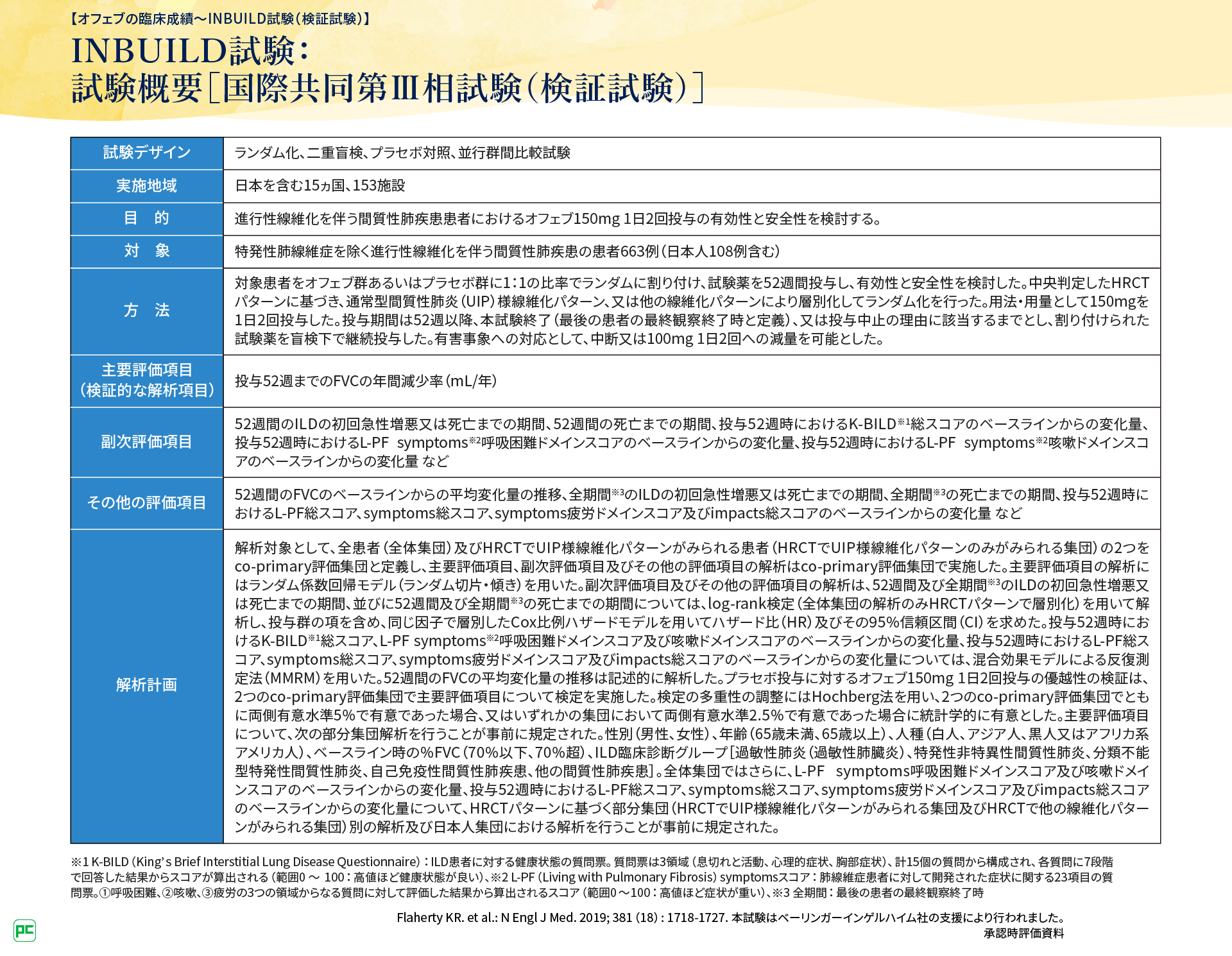 このようにINBUILD試験の組み入れ対象は、個々の疾患とする従来の考え方とは異なり、ILDのうち線維化がだんだんと進行している一群という捉え方をしました。PF-ILDというこれまでにない新しい概念の基準を仮定して新薬の開発を行う、当時としてチャレンジングな試験でありました。
