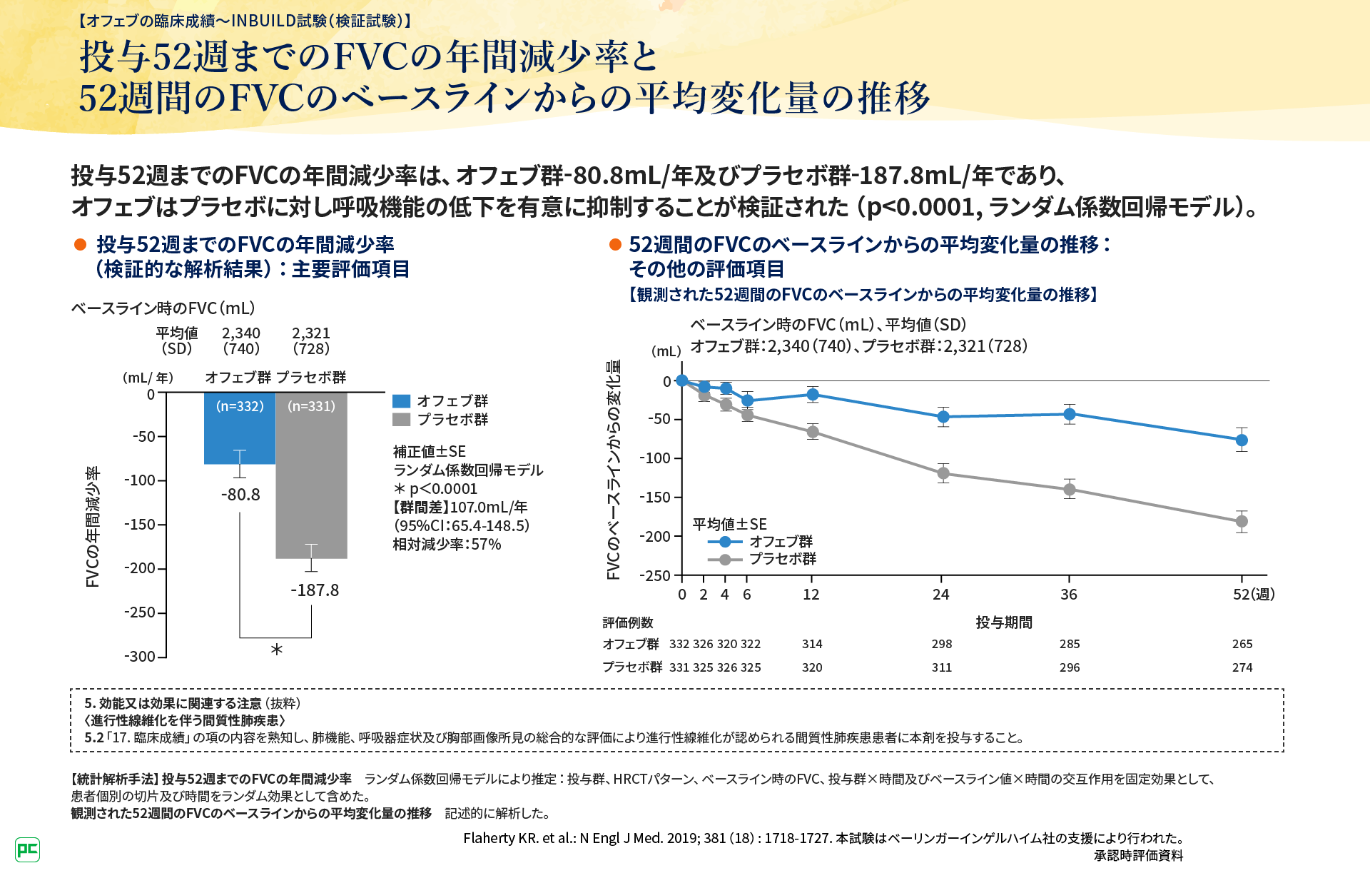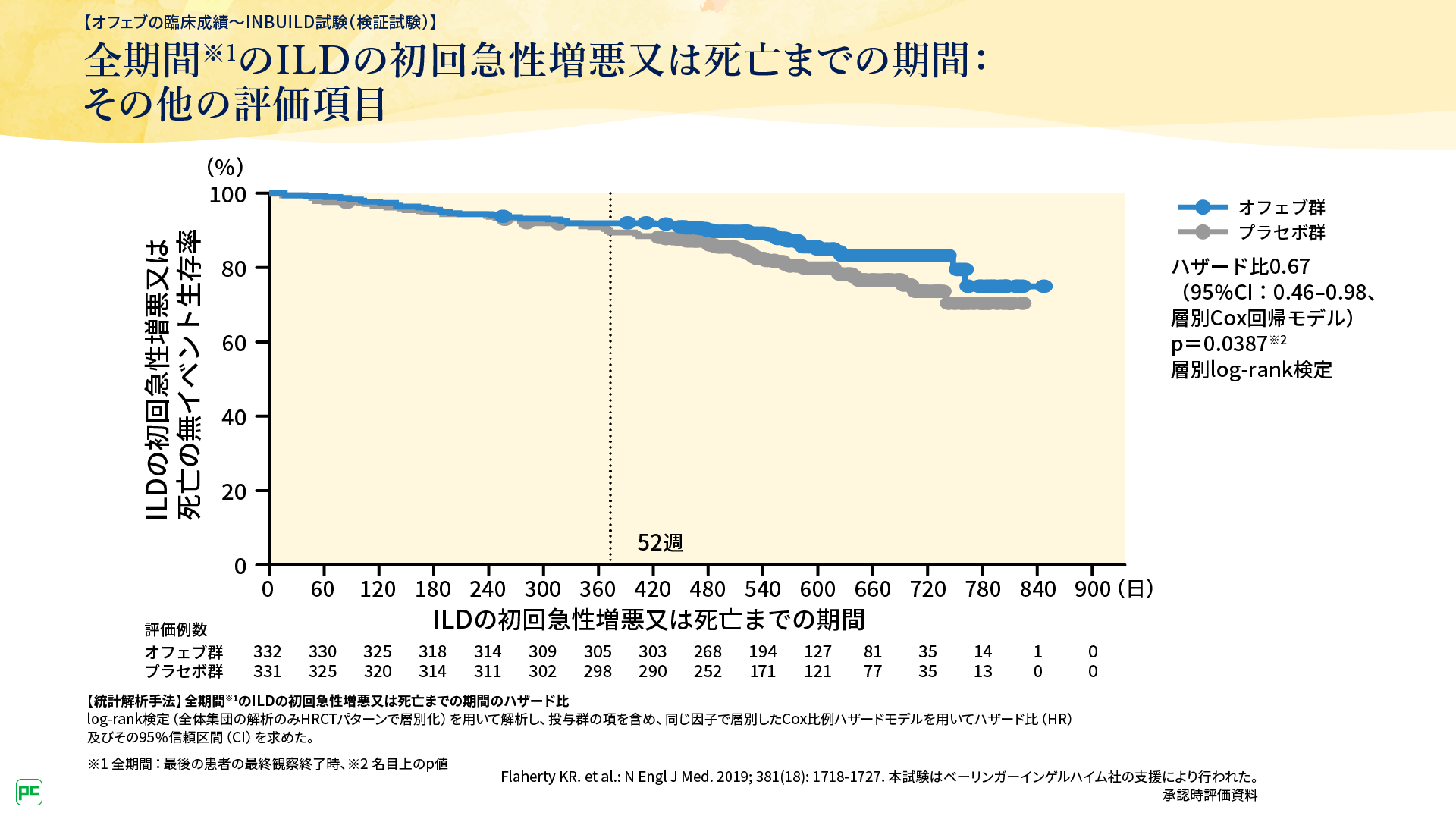 全期間※のILDの初回急性増悪又は死亡までの期間の解析で、オフェブ群のプラセボ群に対するハザード比は0.67であり(p=0.0387、層別log-rank検定、名目上のp値)、オフェブ群では急性増悪や死亡のリスクの低下がみられました(図6)。