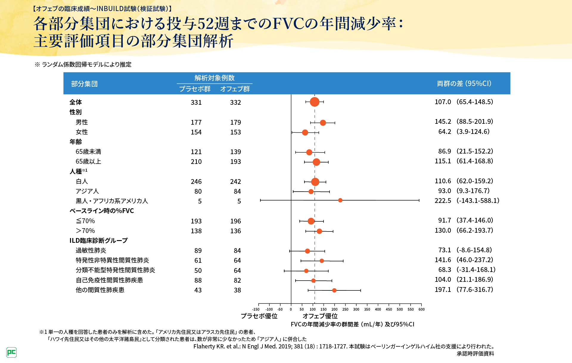 INBUILD試験の主要評価項目は、投与52週までのFVCの年間減少率でした。この結果、オフェブはプラセボに対し呼吸機能の低下を有意に抑制することが検証されました(p<0.0001, ランダム係数回帰モデル)(図4)。また%FVCを含む、さまざまなベースラインで部分集団解析を実施した結果、交互作用のp値0.05を基準として主要評価項目に影響を与えるベースラインの部分集団はみられませんでした(図5)。