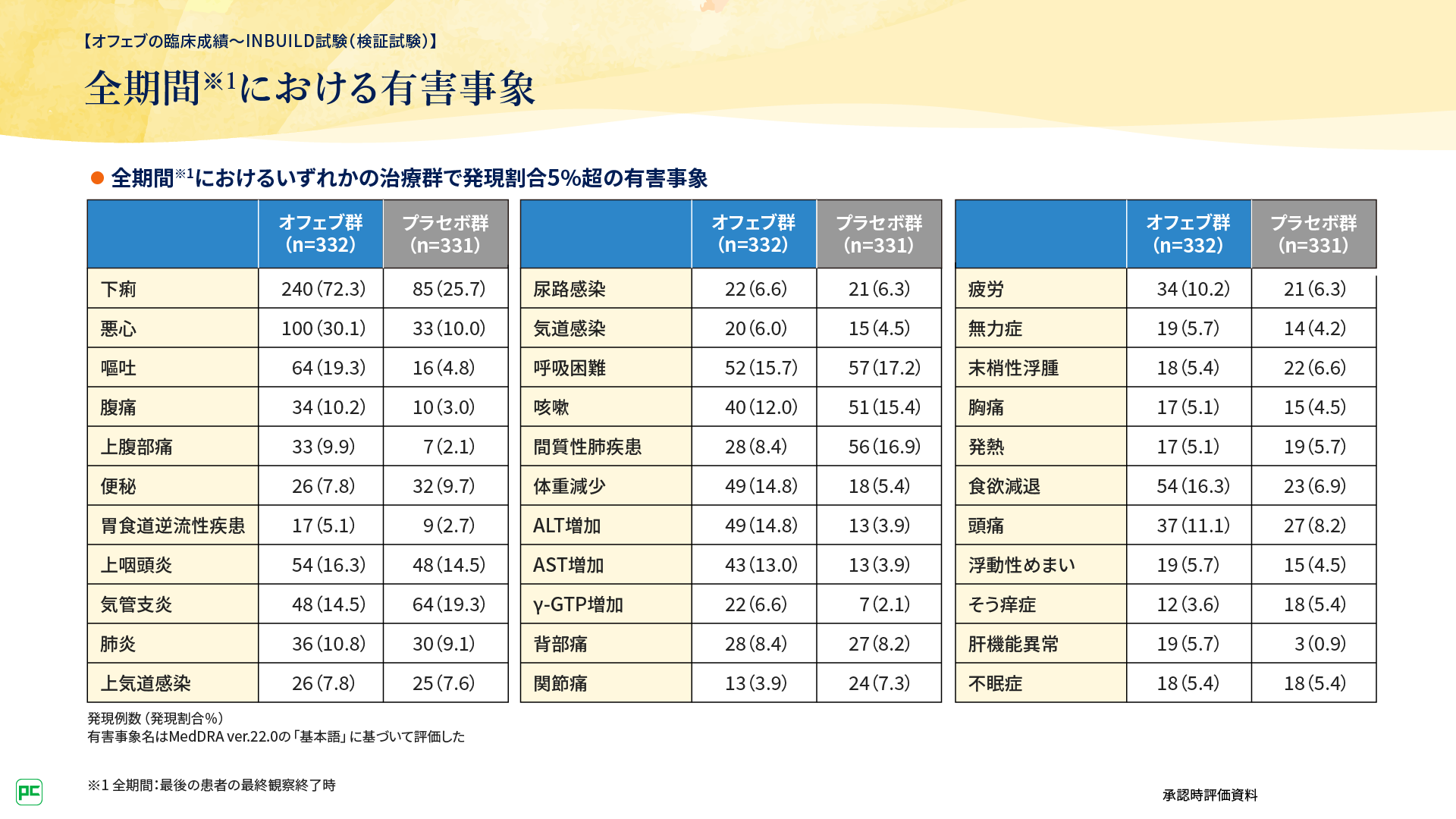 また、有害事象はオフェブ群では332例中326例(98.2%)、プラセボ群331例中308例(93.1%)に認められました。オフェブ群における主な有害事象として下痢(72.3%)や悪心(30.1%)、嘔吐(19.3%)などが認められました。重篤な有害事象は147例に認められ、主なものは肺炎24例、間質性肺疾患19例、急性呼吸不全16例でした。(図7、8)。