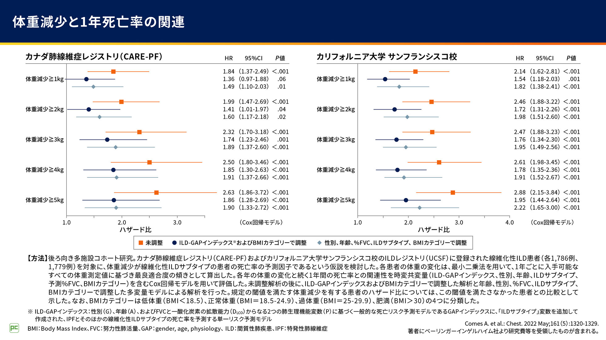 当院の場合、間質性肺疾患の診断時など、疾患が進行していない初期段階から、医師の指示に基づいて初回の栄養指導を行うことが多くあります。その背景には、間質性肺疾患患者さんにおいて体重減少が予後に影響するということが報告されているためです(図1)1)。