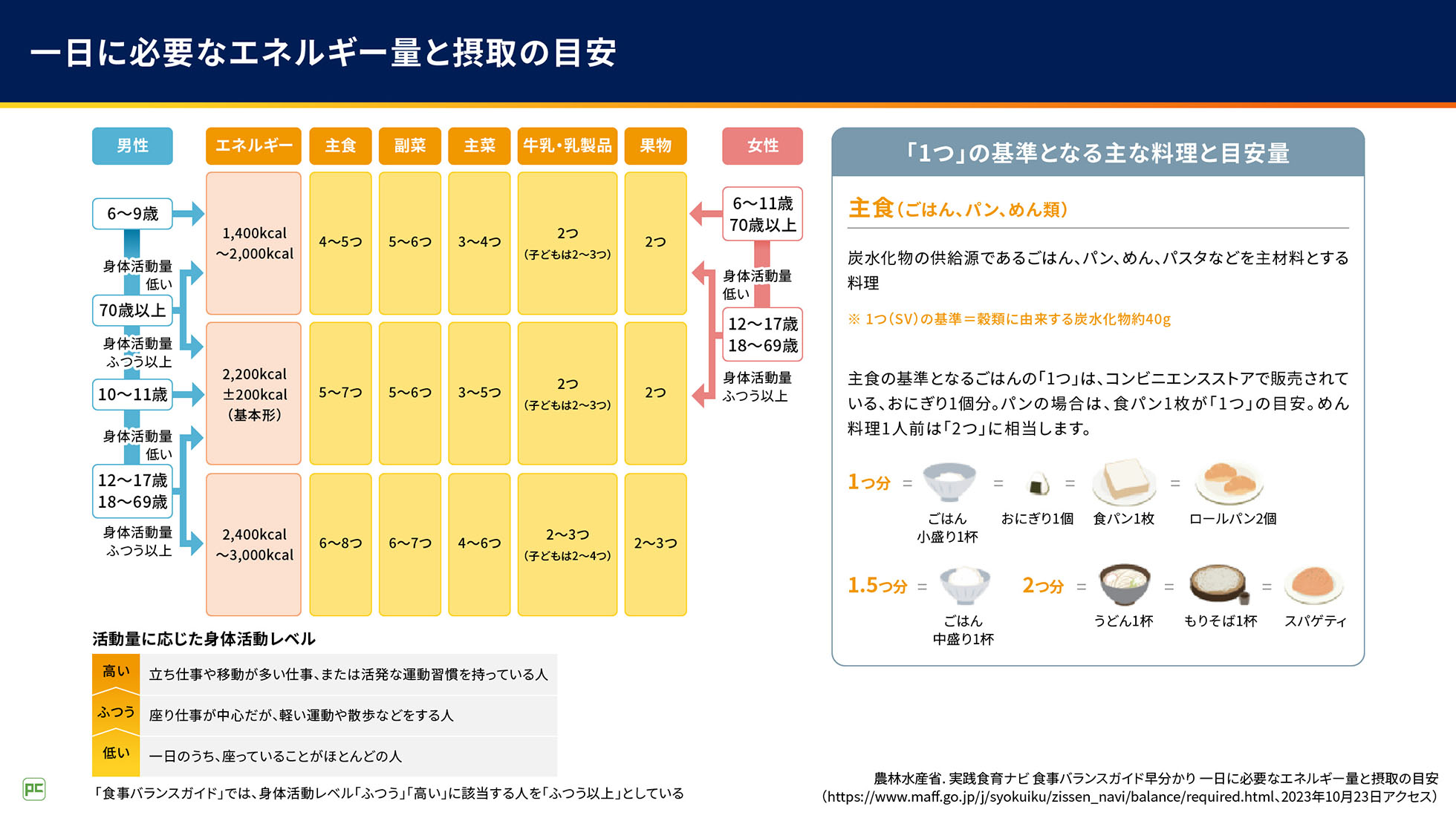 間質性肺疾患の進行がそれほど進んでいない患者さんの場合は、そもそも患者さんご自身が食事量に問題はないと思っている方もいらっしゃいます。しかし、患者さんに毎日の食事内容をお伺いすると、実際には食事量が足りていないことが多くあります。そのような患者さんに対しては、患者さんご自身に「痩せてきている」ことをまずお伝えします。そのうえで食事量が足りていないことと、体重減少を防ぐために適切な食事量(図2)を規則正しく朝昼晩の食事で摂る必要があることをお話しします。