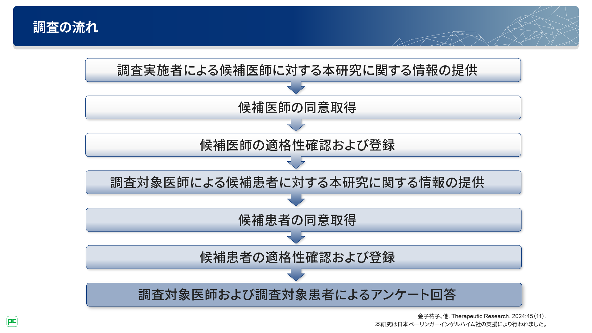 本調査では、医療従事者向けポータルサイトに登録のある医師パネルを介して候補医師を募集しました。また、候補患者さんは、登録対象医師から紹介されたPF‒ILD患者さんから募集しました(図2,3)。