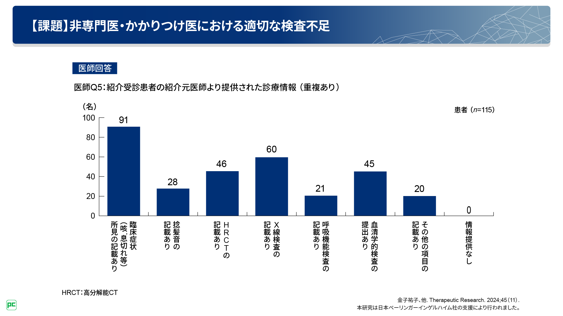 今回の調査結果では、紹介元医師から提供された診療情報にHRCT検査が含まれていた患者さんの割合は40%(115名中46名)でした(図11)。