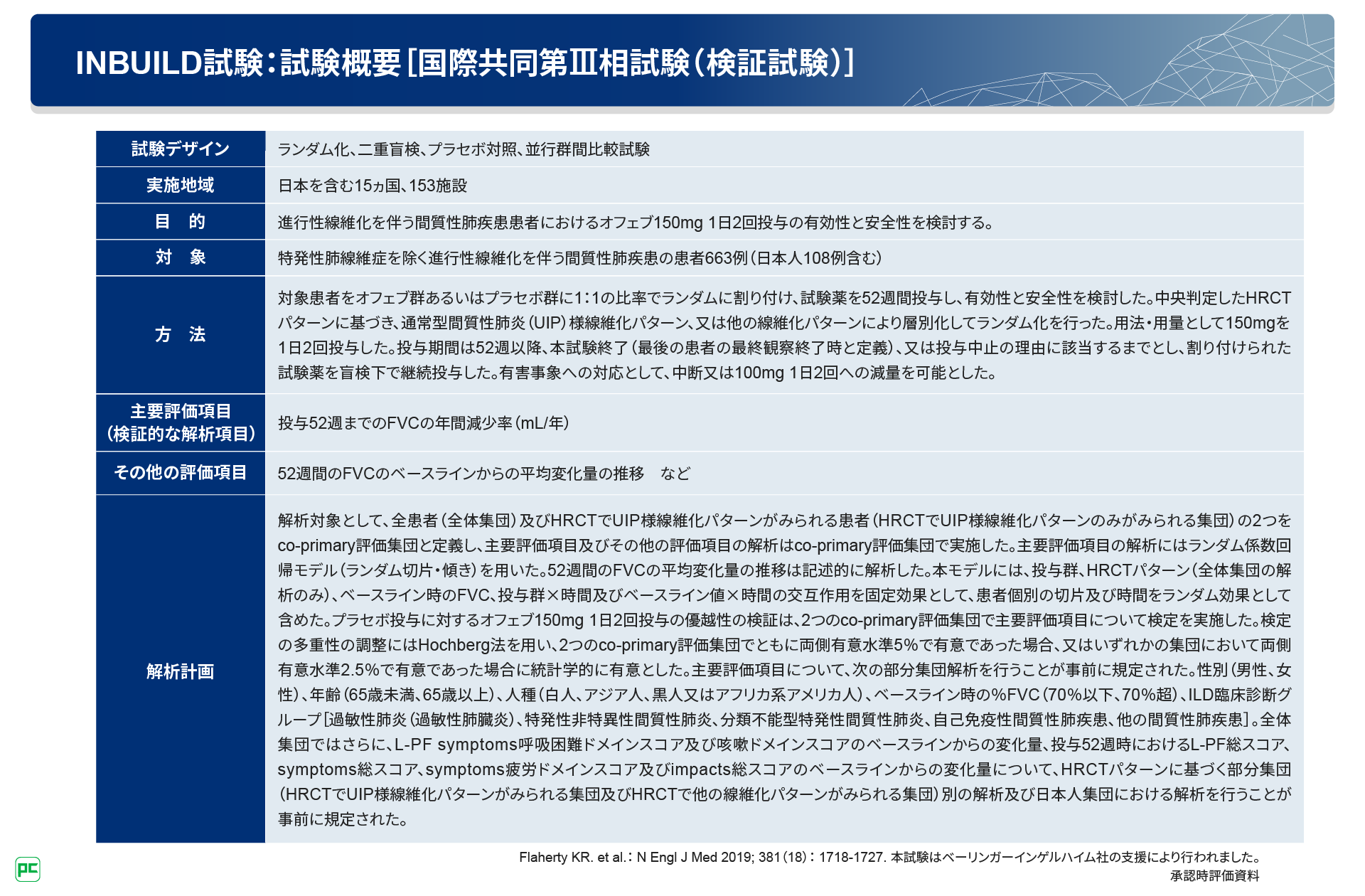 抗線維化剤であるオフェブは、PF-ILDにおける治療選択肢のひとつです。ここで、オフェブの国際共同第Ⅲ相試験INBUILD試験についてご紹介します。